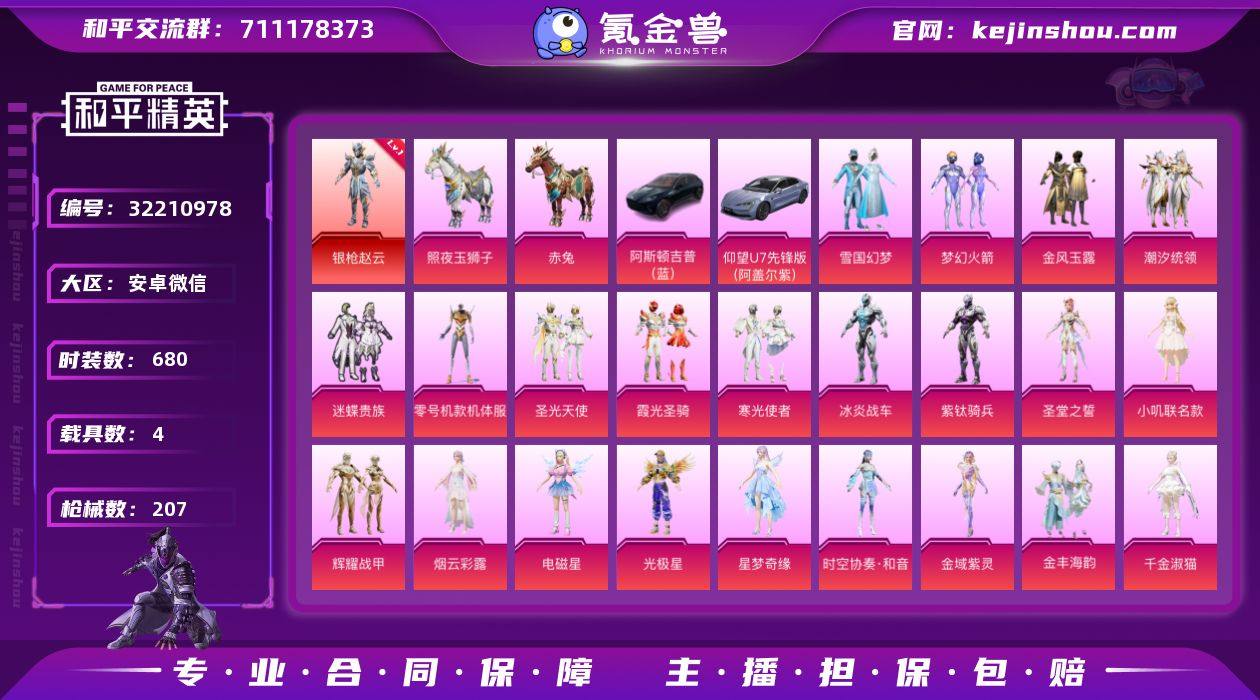 实名: 可修改 时装数: 680 载具数: 4 枪械数: 207 战备数: 4 神级装扮: 银枪赵云 热门装扮: 梦幻火箭(新101),呆萌铁蟹,金风玉露,浪漫波比,鹰眼刺客,潮汐统领,迷蝶贵族,雪国幻梦,零号机款机体服,圣光天使,霞光圣骑,寒光使者,大橘为重,第五大道,紫钛骑兵,冰炎战车,圣堂之誓,小叽联名款,辉耀战甲,烟云彩露,电磁星,光极星,星梦奇缘,金域紫灵,金丰海韵,时空协奏·和音,千金淑猫 载具: 阿斯顿·马丁DBX(蓝),赤兔,照夜玉狮子,仰望U7先锋版(阿盖尔紫) 稀有枪皮: DP-28扶摇飞仙,M416心之恋语,AKM星际浪客,M762苔丝玫瑰,SCAR-L-锦绣绵绵,蜜獾辉耀战甲,UMP45量子极限,PKM-守护天翼,GROZA-精灵之光,DP-28-千金淑猫,AKS-74U-信仰神谕,Kar98K-巳巳如意 亮点: 【优质装备】:银枪赵云,一级银枪赵云(1级赵云),雪国幻梦(冰雪女王),零号机款机体服(黄螳螂),Mark.06(新蓝螳螂),暗影哥特(红眼罩)