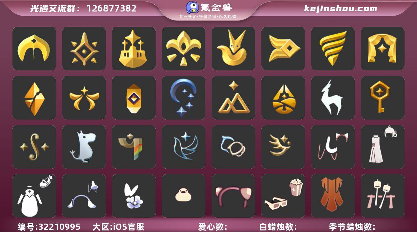 账号类型: 手机账号 季节已毕业: 圣岛季,预言季,梦想季,小王子季,风行季,潜海季,表演季,破晓季,欧若拉季,集结季,夜行季,追忆季,拾光季,归巢季,九色鹿季,筑巢季,二重奏季,姆明季,彩染季,青鸟季,双星季,迁徙季 完成地图: 晨岛,云野,雨林,霞谷,暮土,禁阁,全图毕业 珍稀物品: 阿努比斯(狗头),白枭,透明蝶翼斗,玫瑰花 礼包: 蝙蝠套,巫师,围巾,小狐狸,欧若拉之翼,九色鹿角,音乐桌,绊爱,大铁头,鹿角,蜘蛛斗,兔子鞋,运动鞋,秋千,茶桌,茶壶,白绒金,瑞雪,女巫裙,福娃,跷跷板,小船,吉他,灯笼,奔跑裤子,致爱装扮,奔跑发型,雪花球,橘子,贝壳,黄伞,红伞,兔子,南瓜,枯角,雪花,鲤鱼,竖琴,电吉他,tgc,水母,猫背饰,星月头饰,彩虹耳钉,彩虹耳机,雪怪斗,新年裤,蝴蝶结,魔法棒,海螺,四叶草,暗彩装扮,向日葵套,小提琴,透明蛛丝,伯爵面具,飞蛾套,新年耳钉,浪漫流星斗,彩虹泡泡机,日光耳环,姆明饰品套装,史力奇套装,史力奇帽子,向日葵连衣裙,蛛网朋克,园丁装扮,小狗周年发饰,篝火点心礼包,奉献斗篷,粽子发饰礼包,周年影院套餐礼包,小黄鸭发饰礼包,蝴蝶与花发饰礼包,活力海牛礼包,周年礼包,鹊桥相会套装,皮皮猫套装礼包 裤子: 武士裤,背带裤,白棉裤,搓澡巾 面具: 黄鼠狼,红狐狸,阿努比斯 面饰: 红耳机,黑框眼镜 项链: 围巾 发型: 蝴蝶结,正太,樱花,公主头,虚荣,猫耳,白枭 头饰: 花环 斗篷: 白金,红金,白鸟斗,花瓣斗篷,荧蓝斗篷 配饰: 雨伞,排箫,高音钢琴,吉他,笛子,大铃铛乐器,乐器 亮点: 重塑药水24