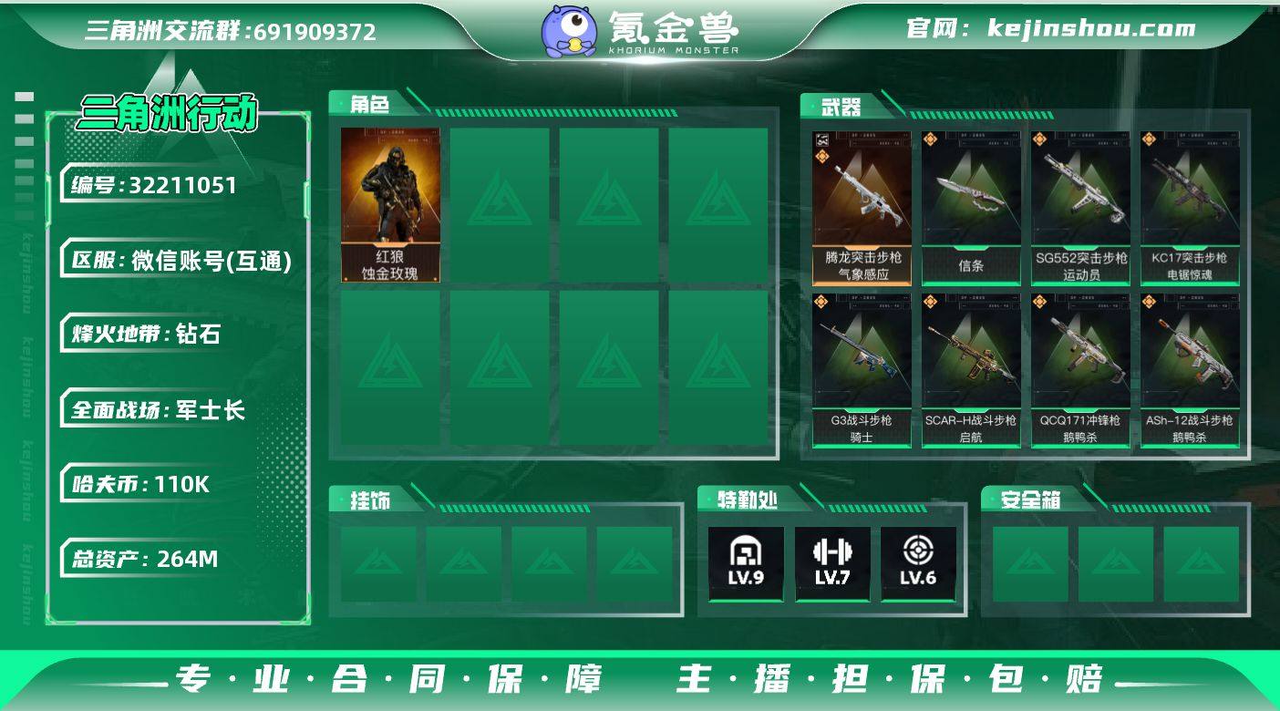 [16730524]总资产:264.9M 2干员外观 1近战传说 11传说枪械 哈夫币:110K 可二次 可修改实名 【烽火地带段位】钻石 【全面战场段位】军士长 【干员外观】红狼-蚀金玫瑰,骇爪-维什戴尔 【传说武器皮肤】近战-信条,腾龙突击步枪-气象感应(典藏),CAR-15突击步枪-阿米娅,SG552突击步枪-运动员,SCAR-H战斗步枪-启航,ASh-12战斗步枪-鹅鸭杀,QCQ171冲锋枪-鹅鸭杀,QJB201轻机枪-鹅鸭杀,G3战斗步枪-骑士,KC17突击步枪-电锯惊魂,M4A1突击步枪-蚀金玫瑰