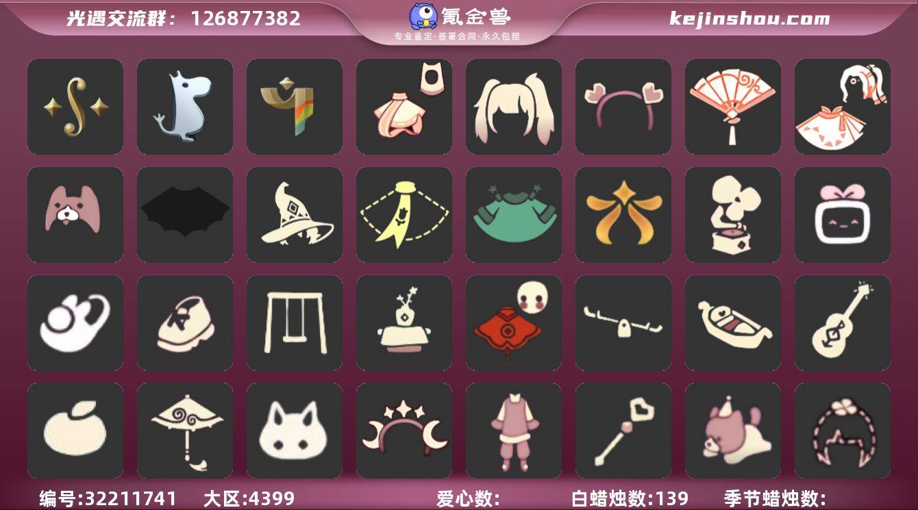 安卓官服 手机账号 3毕业季 5毕业图 139蜡烛 【季节已毕业】二重奏季,姆明季,彩染季 【完成地图】云野,雨林,霞谷,墓土(暮土),禁阁 【礼包】风之旅人白袍(超凡风之旅人礼包),线框斗篷礼包(周年线框斗篷),兔子鞋(兔子拖鞋),运动鞋(跃动跑鞋),新年裤(瑞气服饰),暗彩装扮(彩虹武士裤),姆明饰品套装(姆明尾巴),巫师(巫师帽),渐变双马尾发型礼包(双马尾发型),橘子(大橘大利),奥利奥(周年庆抱枕),兔子(玉兔头饰)(玉兔发饰)(兔子发饰),心心相印发饰礼包,四叶草(四叶草头饰),星月头饰(星月头冠),新年耳钉(金鳞耳饰),围巾(小王子斗篷)(小王子围巾),星球斗(星球夹克),欧若拉之翼,福娃(福娃礼包)(春之日礼包)(铜钱斗),蝙蝠套(蝙蝠斗篷)(南瓜头),衔福献瑞礼包(衔福献瑞斗篷),吉他(音韵吉他)(白吉他),小提琴(凯旋提琴),红伞(瑞气纸伞),魔法棒(惊喜手杖)(仙女棒),献瑞折扇礼包,秋千(情人秋千),跷跷板(情人跷跷板),茶桌(花憩茶桌),音乐桌(网易云留声机),小船(情人小船),大铁头,小狗周年发饰(小狗周年头饰) 【裤子】妮妮裙子(妮妮长裙),武士裤 【面具】辉光羚羊面具 【发型】虚荣 【头饰】平顶帽 【斗篷】彩染围巾斗篷,绿芽,海洋斗 【配饰】小红伞(姆明红伞)(姆明大伞),姆明抱枕,雨伞