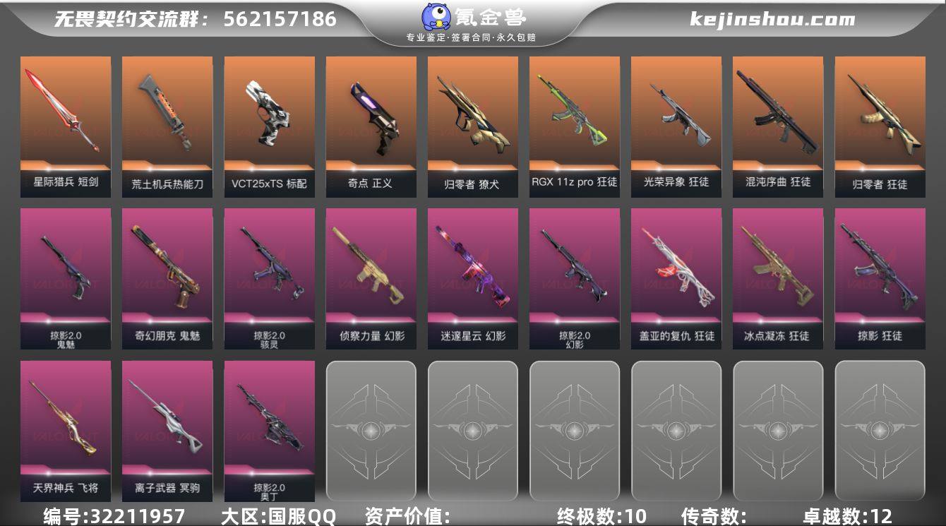 【套装】:VCT 2025 赛季套装 【英雄】:幻棱,炼狱,维斯,暮蝶,钛狐,壹决,铁臂,捷风,幽影,不死鸟,贤者,猎枭,蝰蛇,零,芮娜,奇乐,尚勃勒,霓虹,斯凯,夜露,盖可,黑梦,钢锁 【近战武器】:近战武器-穿花蝴蝶,近战武器-VCT 2025 爪刀,近战武器-紫金爪刀,近战武器-诡秘蛇影 军刀,近战武器-神圣领域 战刀,近战武器-日耀风暴 遗器 【狂徒】:狂徒-塑水宗,狂徒-创·纪元,狂徒-海洋之星,狂徒-诡秘蛇影 【幻影】:幻影-侦察力量,幻影-异鳞魔蛇,幻影-神圣领域,幻影-末日之翼 【戍卫】:戍卫-噬影者,戍卫-月球哨兵,戍卫-折光棱晶 【獠犬】:獠犬-神圣领域 【冥驹】:冥驹-离子武器,冥驹-星云暗涌 【飞将】:飞将-西部未来,飞将-末日之翼 【莽侠】:莽侠-诡秘蛇影,莽侠-月球哨兵 【战神】:战神-神圣领域 【奥丁】:奥丁-末日之翼 【判官】:判官-诡秘蛇影 【雄鹿】:雄鹿-月球哨兵 【骇灵】:骇灵-星云暗涌 【蜂刺】:蜂刺-星云暗涌,蜂刺-折光棱晶 【标配】:标配-折光棱晶 【VCT手枪】:标配-VCT25 x BLG 【正义】:正义-归零者//2.0,正义-超限闪存,正义-纳米打击,正义-月球哨兵 【鬼魅】:鬼魅-艾沃莉的梦之翼,鬼魅-诡秘蛇影,鬼魅-星云暗涌 【狂怒】:狂怒-神圣领域 【短炮】:短炮-末日之翼 【卡面】:终章:激斗汉堡 卡面,进入射程 卡面,精灵大战 卡面,欢迎来到底城 卡面,南瓜盛典 卡面,VCT CN首冠 卡面,修车达人 卡面,热舞环节 卡面,正义的化身 卡面,最高舞台 卡面,梦幻奶茶 卡面,西装暴徒 卡面,无畏契约GO!第一卷:芮娜 卡面,无畏契约GO!第一卷:零 卡面,沙尘幻旅 卡面,代号红色 卡面,新兵报到 卡面,V契约 卡面,无畏契约 卡面 【喷漆】:嗨宝南瓜灯 喷漆,都算到了 喷漆,控场勿近 喷漆,小丑猫 喷漆,熊抱 喷漆,蛋糕还是爆能器? 喷漆,超级粉丝 喷漆,...