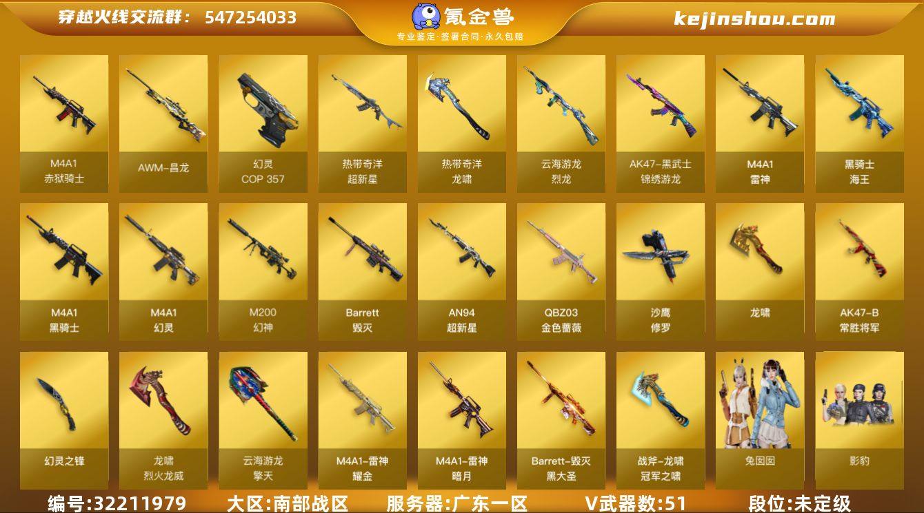广东一区-50V-0王者武器数-0炫金武器数 【热门武器】:QBZ03-金色蔷薇,M200-幻神,死亡之眼,毒蜂,M4A1-黑骑士,COP 357-幻灵*3,沙鹰-修罗 【音效卡】:AWM-昌龙-怀旧音效卡 【皮肤】:幻神-宠儿-2021MVP,雷神-暗月,雷神-耀金皮肤,雷神-维纳斯皮肤,雷神-源计划2.0专属 皮肤,毁灭-黑大圣皮肤,毁灭-神秘黑洞皮肤,毁灭-虹光风暴 皮肤,龙啸-冠军之啸 【角色】:影豹,零·纪元,战地猎狐,奇洋探员,云海玲珑,暗夜-X,北极狐-X,芳心审判者,飞虎队-X,风暴女,娟娟,兰-新年限定,猎狐者-追月,灵狐者-黄金海岸,灵狐者-七夕宝贝,麻雀,曼陀罗-X,玫瑰花神,潘多拉-X,潘多拉-甜心教官,赛斯-X,铁骑荣耀,兔囡囡,新娜塔莎,樱-战斗天使,影武者-X,游珑儿 【人偶武器】:迷你波特博士,夺魂,迷你火种,迷你生化手雷,生化手雷-机甲核心,深渊终结者手雷,迷你巨石泰坦-魔花研究所,灵狐娃娃手雷 【暴走生化】:毒蜂,死亡之眼,超级对讲机 【挑战大师】:冰龙粉碎者-白马银枪,激光毁灭者III-白马银枪*2,激光毁灭者III,神圣爆裂者-末日III 【英雄级武器】:M4A1-雷神*2,M4A1-黑骑士,AN94-超新星,M4A1-幻灵,黑武士-锦绣游龙,超新星-热带奇洋,QBZ03-金色蔷薇,黑骑士-海王,AK47-B-常胜将军,机械迷城-穹宇,Barrett-毁灭,M200-幻神,烈龙-云海游龙,沙鹰-修罗,COP 357-幻灵*3,龙啸*2,幻灵之锋,擎天-云海游龙,龙啸-热带奇洋,龙啸-烈火龙威,高爆手雷-幻灵*8,手雷-云海游龙,手雷-热带奇洋,闪光弹-幻灵*7,烟雾弹-幻灵*8,M4A1-赤狱骑士,M4A1-苍鸣雷神,AK47-竞魂无影,AWM-昌龙,Barrett-碧霄极光 【源级武器】:源·火麒麟,魂·火麒麟-百城,源-黑龙*2,御·黑龙-龙太子*2,源·雷神,魂·雷神-诺拉,魂·雷神-神秘按键,魂·雷神-新春神龙,魂-雷神-萌杀,御·雷神-机甲刑天*2,御·雷神-烈...