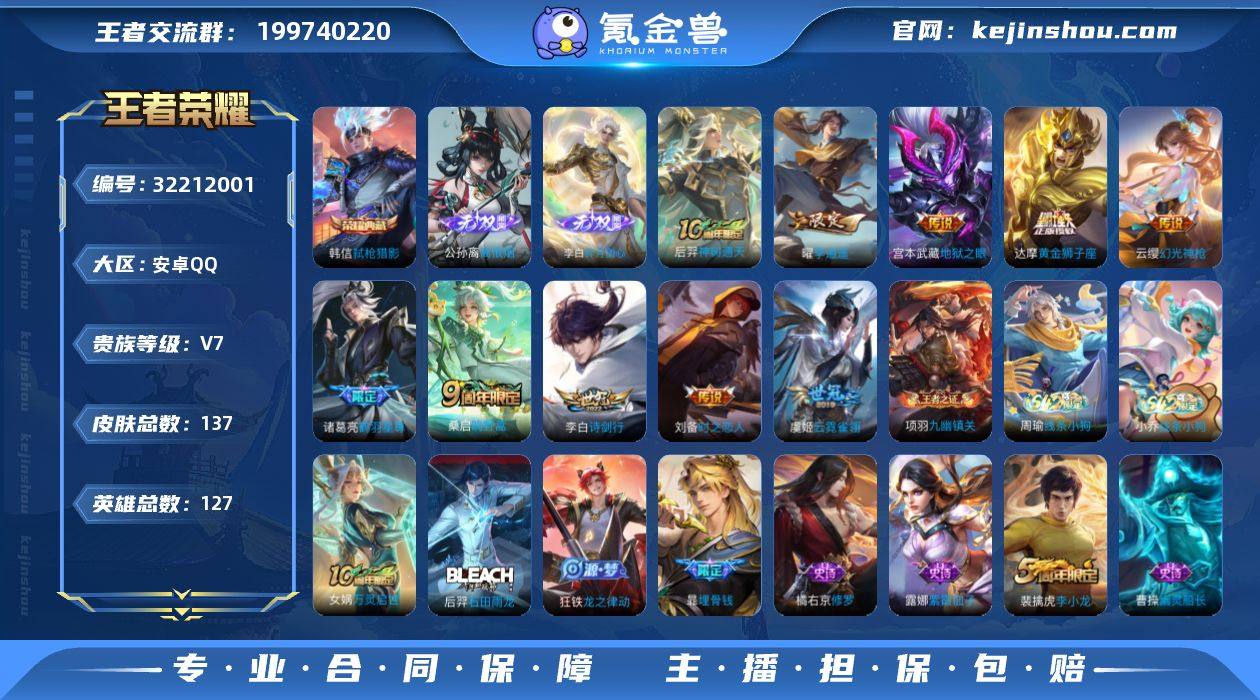 安卓Q-V7-最强王者段位-127英雄-137皮肤-1典藏皮肤-2无双-1珍品传说-11传说-34史诗【英雄全皮】:敖隐全皮【荣耀典藏】:韩信弑枪猎影【无双皮肤】:公孙离离恨烟,李白碎月剑心时之思念 8543战力李白【珍品传说】:伽罗沧流箭【传说皮肤】:马超神骥逐星野,后羿神树通天,云缨幻光神枪,桑启鸣野蒿,诸葛亮鹤羽星尊,李白诗剑行,曜李逍遥 ,刘备时之恋人,虞姬云霓雀翎,达摩黄金狮子座,宫本武藏地狱之眼【限定皮肤】:公孙离离恨烟,暃埋骨钱,狄仁杰阴阳师,赵云皇家上将,狄仁杰魔术师,达摩沙漠行僧,项羽海滩派对,老夫子醍醐杖,兰陵王金庭之子,钟馗驱傩正仪,鬼谷子原初探秘者,诸葛亮鹤羽星尊,裴擒虎李小龙,裴擒虎擒涛扼浪,曜李逍遥 ,鲁班大师探海日志,张良古海寻踪,高渐离燃音魔法,妲己灵卜魔法,鬼谷子天穹祈灯,李白碎月剑心,鲁班七号蔬乡物语,李元芳蔬乡物语,刘邦剑破天穹,周瑜熔金海岸【赛季限定】:老夫子醍醐杖,鬼谷子原初探秘者,钟馗驱傩正仪,达摩沙漠行僧,兰陵王金庭之子,裴擒虎擒涛扼浪,鲁班大师探海日志,张良古海寻踪,鬼谷子天穹祈灯,刘邦剑破天穹,东皇太一噬灭天穹,钟馗虚灵犬护,亚瑟荣光之誓,牛魔星界战将,项羽九幽镇关【战令限定】:高渐离燃音魔法,妲己灵卜魔法,鲁班七号蔬乡物语,李元芳蔬乡物语,周瑜线条小狗,小乔线条小狗【史诗皮肤】:明世隐百晓客,周瑜线条小狗,小乔线条小狗,项羽九幽镇关,女娲万灵启世,后羿石田雨龙,狂铁龙之律动,弈星万物之道,牛魔星界战将,暃埋骨钱,鲁班七号蔬乡物语,高渐离燃音魔法,妲己灵卜魔法,弈星滕王阁序,裴擒虎李小龙,橘右京修罗,狄仁杰鹰眼统帅,白起星夜王子,程咬金功夫厨神,蔡文姬舞动绿茵,百里守约特工魅影,兰陵王暗隐猎兽者,小乔缤纷独角兽,夏侯惇乘风破浪,刘邦德古拉伯爵,张飞乱世虎臣,...