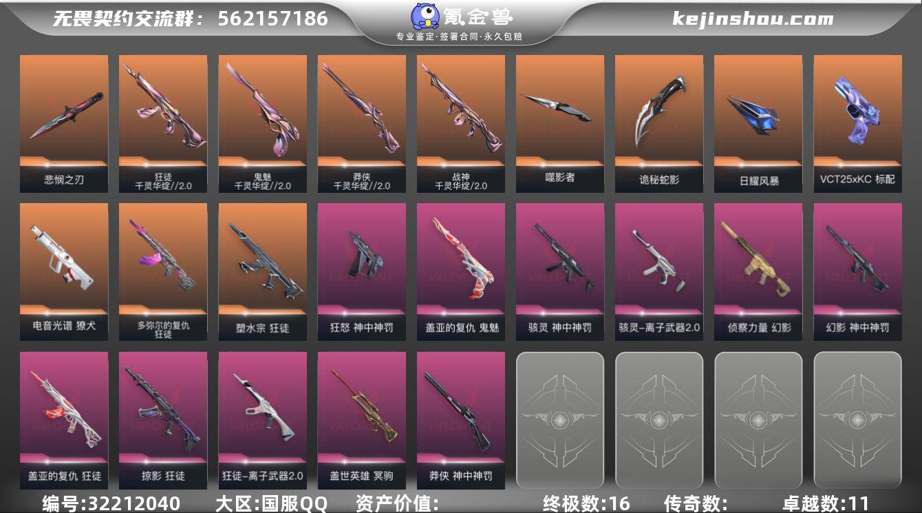 【套装】:无畏契约季前邀请赛套装,千灵华绽//2.0套装,神中神罚套装【英雄】:幻棱,炼狱,维斯,暮蝶,钛狐,壹决,铁臂,捷风,雷兹,幽影,不死鸟,贤者,猎枭,蝰蛇,零,芮娜,尚勃勒,霓虹,斯凯,夜露,星礈,K/O,海神,盖可,黑梦,钢锁【近战武器】:近战武器-碎心裂刃,近战武器-无畏契约季前邀请赛 悲悯之刃,近战武器-流风回雪,近战武器-神之刃,近战武器-噬影者 簇刃,近战武器-诡秘蛇影 军刀,近战武器-日耀风暴 遗器【狂徒】:狂徒-塑水宗,狂徒-多弥尔的复仇,狂徒-千灵华绽//2.0,狂徒-掠影,狂徒-盖亚的复仇,狂徒-离子武器//2.0,狂徒-诡秘蛇影【幻影】:幻影-侦察力量,幻影-神中神罚,幻影-末日之翼【戍卫】:戍卫-折光棱晶【獠犬】:獠犬-电音光谱,獠犬-电音光谱【冥驹】:冥驹-盖世英雄【飞将】:飞将-末日之翼【莽侠】:莽侠-千灵华绽//2.0,莽侠-神中神罚,莽侠-诡秘蛇影【战神】:战神-千灵华绽//2.0【奥丁】:奥丁-末日之翼【判官】:判官-诡秘蛇影【骇灵】:骇灵-离子武器//2.0,骇灵-神中神罚【蜂刺】:蜂刺-折光棱晶【标配】:标配-折光棱晶【VCT手枪】:标配-VCT25 x KC【鬼魅】:鬼魅-千灵华绽//2.0,鬼魅-盖亚的复仇,鬼魅-诡秘蛇影【狂怒】:狂怒-神中神罚【短炮】:短炮-末日之翼【卡面】:Clutch 卡面,无畏契约GO!第一卷:芮娜 卡面,无畏契约GO!第一卷:零 卡面,无畏契约GO!第一卷:贤者 卡面,钢锁vs盖可 卡面,代号红色 卡面,新兵报到 卡面,V契约 卡面,无畏契约 卡面【喷漆】:买装还是存钱 喷漆,无畏契约GO!第一卷:芮娜 喷漆,无畏契约GO!第一卷:零 喷漆,胜利属于无畏契约 喷漆,GLHF 喷漆,无畏契约 喷漆【挂饰】:《双城之战》魄罗 挂饰,无畏契约 纪念币 挂饰