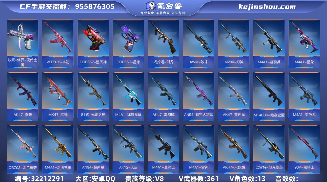 【FC-ZY2J3F】【6至尊2同框雷霆王者m4-巴雷特-奉先套最终消灭无双-本初套-星象套-仁德套-妙才套-王翼-王武---5cop】手Q-安卓,等级127,VIP0,V武器数:361 ,V角色数:13 【人物角色】乔月,关小雨,海滩夜玫瑰,樱,太阳神-曦,大老师,堕天使,葵,洛伊,洛伊,洛伊,萝拉,春节兰,审判者,幻影,猎狐者,奥摩,斯沃特,步练师,秦师,祝融夫人,祝融夫人,炽天使-X,武媚,杨玉凝,蔡文昭,龙妹,木兰,奥妹,蜀雪,妩媚妖姬,灵动武士,变装舞会兰,赛丝,妲姬,斯薇特, 【王者武器】巴雷特-雷霆王者,王者之誉,王者之霆,王者之业,王者之尊,王者之兽,M12S-雷霆王者,王者之蝶,雷霆王者之锋,M4A1-雷霆王者,王者之心,王者之影,王者之翼,王者之武,王者之魂,王者之锋,王者之锋,王者之啸,王者之烈,王者之狱,王者之隐, 【带V枪械】尼泊尔-星象,尼泊尔-星象,巴雷特-毁灭,巴雷特-毁灭,巴雷特-毁灭,巴雷特-毁灭,巴雷特-毁灭,巴雷特-毁灭,巴雷特-毁灭,巴雷特-毁灭,激昂霸王枪,地狱烈炎,尼泊尔-雷霆,尼泊尔-雷霆,双持尼泊尔-变色龙,马来剑-毁灭,马来剑-毁灭,麒麟刺,SCAR-探星者,尼泊尔-铜头铁臂,屠龙,屠龙,屠龙,屠龙,屠龙,屠龙,屠龙,屠龙,神罚战斧,M4A1-冰锋觉醒,QBB95-极光,沙鹰-超新星,铁锹-超新星,GM6-战争风云觉醒,M4A1-变色龙,M4A1-星象,海斯博士双刃-激光,M4A1-沙漠领主,CZS2-血月,M4A1-游骑兵,QCW05-变形金刚·大黄蜂,太白诗仙扇,M4A1-黑骑士,烈焰弓,烈焰弓,M4A1-雷神,打击者-天神,MK47-仁德,M4A1-千变,CBJ-MS-毒蜂,CBJ-MS-毒蜂,AK47-雷麒麟,斩魔剑-天使,沙鹰-宇航兔兔,HK417-炎龙铠甲,蝴蝶刀-天神,AN94-赳赳秦师,末日裁决觉醒,AWM-指南针,M4A1-猎神,双持GLOCK18-本初,KSG-孟获,气勇胆烈戟,AK47-奉先,AK47-黑鲨,AK47-黑鲨...