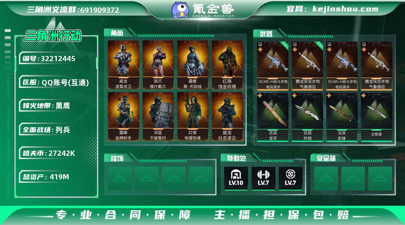 【SJZQH1082】总资产(M):419M/哈夫币(K):27242K/哈夫币(K):27242K/传说枪皮数:46/全面战场等级:50_段位:列兵/烽火地带等级:60_段位:黑鹰/红狼-蚀金玫瑰/露娜-黑·天际线/骇爪-维什戴尔/威龙-凌霄戍卫/威龙-壮志凌云(S3)/蜂医-送葬人·无题密令(S5)/无名-夜鹰(S4)/深蓝-不破誓约(S6)/红狼-电锯惊魂/露娜-金牌射手(S7)/近战-北极星/近战-影锋/近战-怜悯/近战-龙牙/近战-黑鹰/SCAR-H战斗步枪-电玩高手/腾龙突击步枪-气象感应/优品S典藏武器外观-SCAR-H战斗步枪-电玩高手/优品B典藏武器外观-腾龙突击步枪-气象感应/M4A1突击步枪-蚀金玫瑰/M4A1突击步枪-阿米娅/AKM突击步枪-流光铂影/QBZ95-1突击步枪-凌霄戍卫/ASh-12战斗步枪-鹅鸭杀/K416突击步枪-行动记录/M16A4突击步枪-狩猎时刻/SG552突击步枪-运动员/AK-12突击步枪-夜鹰/AK-12突击步枪-特斯拉线圈/SCAR-H战斗步枪-铁艺苍穹/SCAR-H战斗步枪-启航/G3战斗步枪-流光铂影/G3战斗步枪-狩猎时刻/G3战斗步枪-无机神经元/G3战斗步枪-骑士/CAR-15突击步枪-阿米娅/AS Val突击步枪-死神玫瑰/腾龙突击步枪-死神玫瑰/K437突击步枪-北极星/KC17突击步枪-电锯惊魂/Vector冲锋枪-狩猎时刻/Vector冲锋枪-能天使-午夜邮差/UZI冲锋枪-流光铂影/UZI冲锋枪-特斯拉线圈/SMG45冲锋枪-骑士/SR-3M紧凑突击步枪-特斯拉线圈/勇士冲锋枪-能天使-午夜邮差/QCQ171冲锋枪-北极星/QCQ171冲锋枪-鹅鸭杀/M1014霰弹枪-影锋/S12K霰弹枪-无机神经元/S12K霰弹枪-死神玫瑰/725双管霰弹枪-送葬人-无题密令/M250通用机枪-骑士之心/QJB201轻机枪-鹅鸭杀/M14射手步枪-蛮荒/M14射手步枪-缄花/SR-25射手步枪-缄花/R93狙击步枪-维什戴尔/AWM狙击步枪-影锋/.357左轮-缄花/G17-无机神经元/复合弓-黑-天际线/M4A1突击步枪-特勤执行/AKM突击步枪-林中猎手/QBZ95-1突击步枪-曙光/QBZ95-1突击步枪-ACE/QBZ95-1突击...