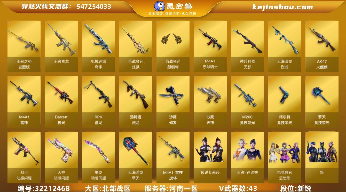 河南一区-48V-3王者武器数-0炫金武器数 【传说角色】:传说艾莉莎 【热门武器】:M200-竞技荣光,炼狱-迷你小钢,汤姆逊-烈龙,RPK-盘龙*6,USP-雷暴,沙鹰-修罗*2 【王者炫金武器】:王者青龙 【音效卡】:炼狱-百战金芒-庆典舞曲音效卡 【皮肤】:雷神-虎将,M4A1-再燃火线,火麒麟-典雅胡桃 皮肤,轻型军用手斧-再燃火线 【角色】:电竞教官-云悠悠,隼,王者-迷迭香,乔伊教练,云海玲珑,葵-阿尔法武装,初恋灵狐,芳心审判者,风暴女,嘉年华灵狐,猎狐者-追月,灵狐-花神,灵狐者-X,曼陀罗-礼服,萌儿,潘多拉-甜心教官,斯沃特-X,樱-战斗天使 【人偶武器】:炼狱-迷你小钢,迷你宝贝,Barrett-云海玲珑,AWM-灵狐-15周年嘉年华,迷你波特博士,迷你生化手雷*2,生化手雷-机甲核心*2 【挑战大师】:神圣爆裂者-末日III 【英雄级武器】:AK47-火麒麟,M4A1-雷神,无影-神兵利器,烈火-动感闪耀,王者之势-觉醒版,白虎之魄-觉醒版,机械迷城-穹宇,Barrett-极光,M200-竞技荣光,RPK-盘龙*6,炼狱-百战金芒,汤姆逊-烈龙,烈龙-云海游龙,沙鹰-修罗*2,沙鹰-天神*2,USP-雷暴,柯尔特-竞技荣光,天神-动感闪耀,擎天-竞技荣光,屠龙-动感闪耀,擎天-云海游龙,麒麟刺-百战金芒,高爆手雷-竞技荣光*2,高爆手雷-神工天巧,手雷-动感闪耀,手雷-云海游龙,闪光弹-竞技荣光*2,烟雾弹-竞技荣光*2,烟雾弹-神工天巧*3,M4A1-赤狱骑士 【道具】:云海游龙炫彩背包,全能枪王背包,百战金芒炫彩背包,女皇终结者-魔龙之吻,救世主-黑桃战神,绿色巨人,灵魂忍者*2,变异宝贝,妖姬,迷雾幽灵*2,生化弹匣,夺命之镰,防化服*3,金色流光-枪王排位*2,星辰流光-枪王排位,语音特效-盛典烟火,萌萌小葵表情,动感闪耀表情,云海游龙表情,防弹头盔*7,防弹衣*7,C4工具钳*7,手雷包*7 【特殊枪械】:1烈龙,6盘龙