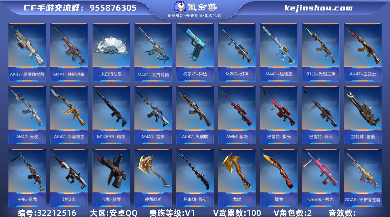 【QZQH115】VIP1/100V/王者之蝶/王者之尊/81式-光明之神/M200-幻神/81式-阿波罗/审判者/刀锋-枪战王者/AK47-火麒麟/AK47-沙漠领主/AK47-天使/AK47-血武士/AK47-木兰/AK47-塔罗牌觉醒/AK47-谜城烟火/M4A1-雷神/M4A1-运输船/M4A1-太白诗仙/M4A1-铁胆虎魄/SCAR-守护者觉醒/M14EBR-暗夜/M14EBR-葫芦山庄/HK417-炎龙铠甲/G36-李星云/QBZ97-浩瀚征途/SBR-湮灭/AWM-裁决/巴雷特-毁灭/巴雷特-极光/RPK-盘龙/加特林-堡垒/QBB95-极光/地狱火/KSG-钟馗觉醒/USP-太白诗仙/沙鹰-修罗/GLOCK18-猎神/改装GLOCK-樱龙·超觉/柯尔特-仲达/女皇利刃-铁胆虎魄/龙啸/神罚战斧/屠龙/太白诗仙扇/马来剑-毁灭/末日裁决觉醒/火麒麟手雷/手雷-芦里乾坤/分裂雷-天使/高爆手雷-无限/粘性手雷-彩虹小白马觉醒/死神闪光弹/闪光弹-天使/火麒麟烟雾弹/烟雾弹-天使
