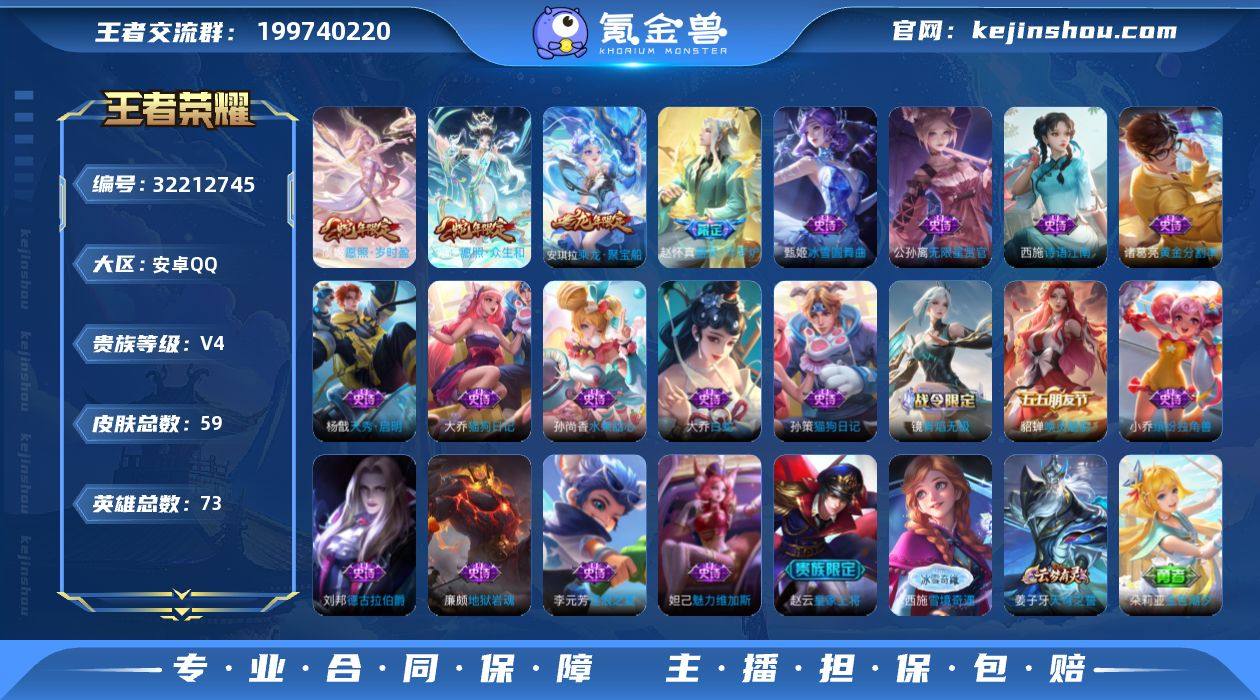 安卓Q-V4-荣耀黄金III段位-73英雄-59皮肤-2传说-19史诗【传说皮肤】:妲己愿照众生和,虞姬愿照岁时盈【限定皮肤】:姜子牙天穹之誓,狄仁杰阴阳师,赵云皇家上将,项羽海滩派对,鬼谷子天穹祈灯,安琪拉乘龙聚宝船,刘邦剑破天穹,程咬金群星魔术团,镜青焰无极,项羽苍威无极,周瑜熔金海岸【年限皮肤】:安琪拉乘龙聚宝船,妲己愿照众生和,虞姬愿照岁时盈【赛季限定】:鬼谷子天穹祈灯,刘邦剑破天穹,姜子牙天穹之誓,东皇太一噬灭天穹,太乙真人谧流熔炉【战令限定】:镜青焰无极,项羽苍威无极【史诗皮肤】:赵怀真器灵浮梦炉,镜青焰无极,安琪拉乘龙聚宝船,貂蝉唤灵魅影,杨戬天秀启明,西施诗语江南,大乔白蛇,公孙离无限星赏官,大乔猫狗日记,孙策猫狗日记,李元芳逐浪之夏,诸葛亮黄金分割率,小乔缤纷独角兽,刘邦德古拉伯爵,妲己魅力维加斯,孙尚香水果甜心,廉颇地狱岩魂,甄姬冰雪圆舞曲,赵云皇家上将【其他皮肤】:少司缘灵卦秘语,东皇太一金福满堂,姜子牙星梦巡礼,西施雪境奇遇,太乙真人谧流熔炉,东皇太一噬灭天穹,盘古敬我三分,周瑜熔金海岸,姜子牙天穹之誓,项羽苍威无极,程咬金群星魔术团,刘邦剑破天穹,朵莉亚金色潮汐,海诺时空谍影,...
