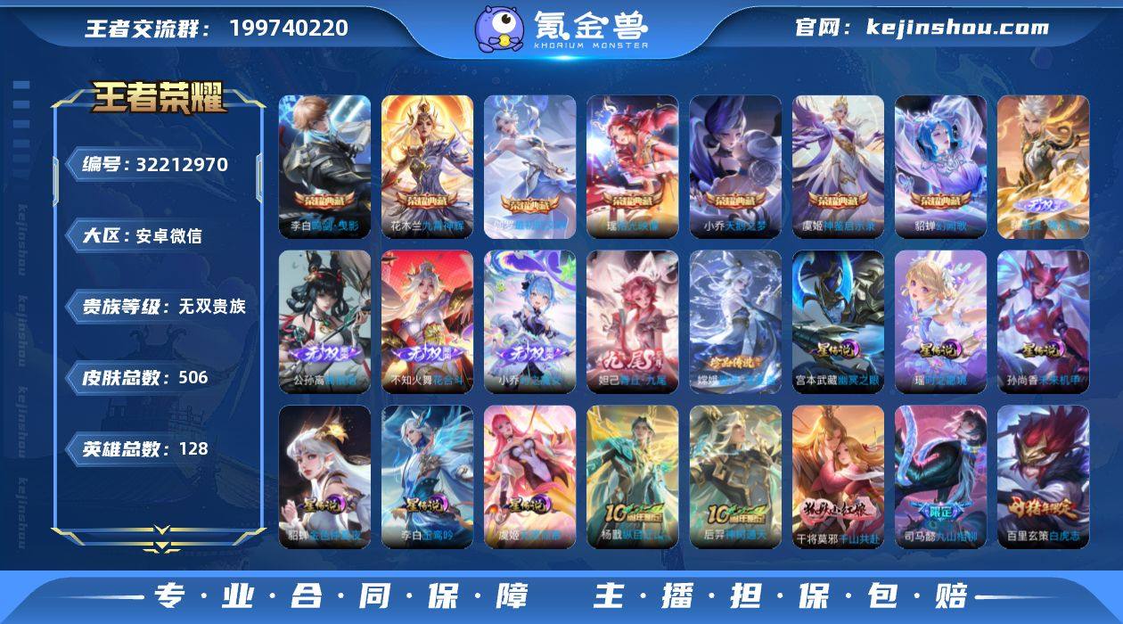 安卓WX-V11-最强王者段位-128英雄-506皮肤-7典藏皮肤-5无双-1珍品传说-66传说-174史诗,中路33,游走32,发育路28,打野23 【英雄全皮】:小乔全皮,司马懿全皮,露娜全皮,孙权全皮,艾琳全皮,不知火舞全皮,娜可露露全皮,杨玉环全皮,嫦娥全皮,西施全皮,司空震全皮,戈娅全皮,空空儿全皮,影全皮,海诺全皮,少司缘全皮 【荣耀典藏】:小乔天鹅之梦,李白鸣剑曳影,花木兰九霄神辉,貂蝉幻阙歌,虞姬神鉴启示录,瑶拾光映像,伽罗最初的交响 【无双皮肤】:妲己青丘九尾,小乔时之魔女,不知火舞花合斗,公孙离离恨烟,曜器灵螭龙剑 【珍品传说】:嫦娥器灵落星盏 【传说皮肤】:杨戬纵目迁山,后羿神树通天,干将莫邪千山共赴,司马懿九山相柳,西施续相思,杨玉环星之鸣奏,司空震愿照山河定,女娲愿照千秋盛,妲己愿照众生和,澜愿照九州拓,蔡文姬愿照福禄聚,虞姬愿照岁时盈,云缨幻光神枪,嬴政玄雷天君,王昭君映山客,桑启鸣野蒿,夏侯惇霜北刀,朵莉亚心动手记,貂蝉曦玄引,孙尚香乘龙问璇玑,艾琳觅芳踪,露娜霜月吟,甄姬至美化雀舞,吕布遇见神鼓,诸葛亮鹤羽星尊,公孙离记忆之芯,夏洛特浮生妄,干将莫邪画中仙,虞姬无限倾心,伽罗炽翼辉光,小乔山海琳琅生,不知火舞绯月行,王昭君星穹之声,娜可露露前尘镜,孙尚香音你闪耀,后羿无尽星芒,大乔挚爱花嫁,孙策挚爱之约,露娜启示之音,蔡文姬花朝如约,女娲补天,孙策末日机甲,瑶时之祈愿,鲁班七号寅虎瑞焰,孙尚香异界灵契,貂蝉遇见胡旋,赵云淬星耀世,王昭君乞巧织情,西施游龙清影,小乔音你心动,李元芳飞鸢探春,公孙离祈雪灵祝,诸葛亮时雨天司,镜炽阳神光,虞姬启明星使,曜云鹰飞将,李信一念神魔,伽罗太华,貂蝉猫影幻舞,干将莫邪久胜战神,虞姬云霓雀翎,百里玄策白虎志,诸葛亮武陵仙君,貂蝉仲夏夜之梦,李白凤求凰...