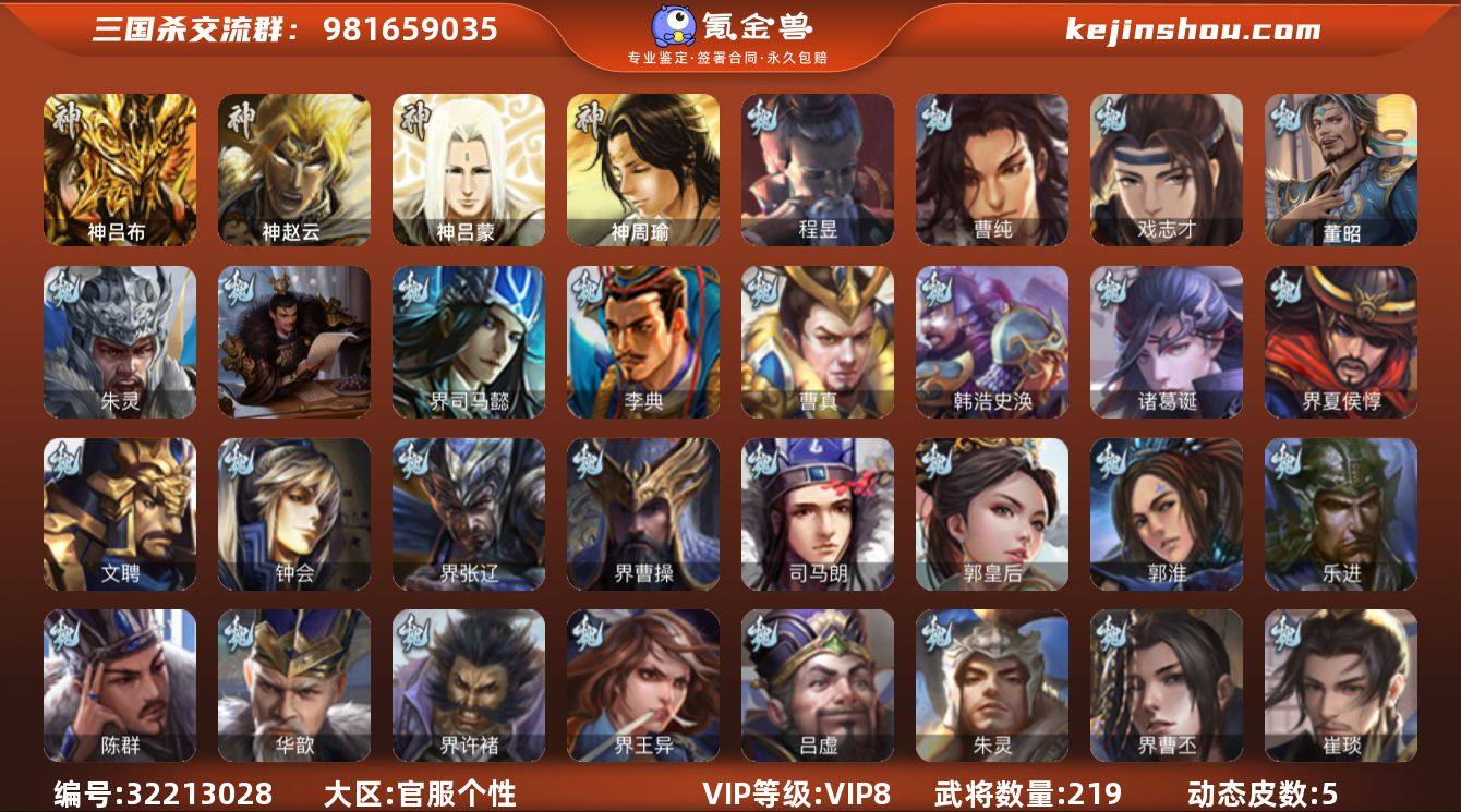 VIP等级: VIP8 官阶: 领军将军 武将数量: 219 动态皮肤数量: 5 神将: 神吕布,神赵云,神吕蒙,神周瑜 魏国武将: 戏志才,曹纯,程昱,张辽,SP蔡文姬,SP关羽,SP贾诩,SP姜维,SP庞德,曹昂,曹操,曹冲,曹丕,曹仁,曹叡,王异,鲁芝,界曹植,荀攸,钟繇,郭嘉,荀彧,阮慧,界郭嘉,崔琰,界曹丕,朱灵,吕虔,界王异,界许褚,华歆,陈群,乐进,郭淮,郭皇后,夏侯惇,司马朗,界曹操,许褚,界张辽,钟会,文聘,曹彰,界夏侯惇,诸葛诞,司马懿,甄姬,徐晃,韩浩史涣,曹真,典韦,夏侯渊,李典,于禁,邓艾,界司马懿,孟达-魏,朱灵(国战),董昭 蜀国武将: 谋马超,谋赵云,界关羽,界诸葛亮,邓芝,界伊籍,界黄月英,界张嶷,赵云,张松,彭羕,界刘备,刘封,糜竺,谋庞统,黄月英,刘巴,关羽,吴懿,祝融,张飞,黄皓,魏延,界周仓,界法正,刘禅,界赵云,关银屏,SP孙尚香,SP徐庶,卧龙诸葛,周仓,界关兴张苞,诸葛亮,界张飞,法正,赵统赵广,界马岱,关平,马岱,界庞统,庞统,诸葛果,马谡,马超,廖化,关兴张苞,孟获,黄忠,刘备,李严,马良,刘谌,彭羕(国战) 吴国武将: 界徐盛,潘濬,周泰,全琮,吕蒙,诸葛恪,界孙尚香,丁奉,孙茹,蒋钦,严畯,界孙权,孙翊,祖茂,界吕蒙,孙登,凌操,朱治,孙尚香,程普,大乔,韩当,陆逊,诸葛瑾,吕范,太史慈,虞翻,界黄盖,孙鲁班,界周瑜,孙权,界孙鲁班,界甘宁,甘宁,界大乔,孙坚,孙鲁育,凌统,岑昏,步练师,周瑜,小乔,潘璋马忠,黄盖,吕岱,孙策,界陆逊,界周泰,界吴国太,谋韩当,徐盛,张昭张纮,陈武蕫袭,朱桓 群国武将: 星黄忠,杨彪,伏完,刘协,华雄,董白,袁术,高顺,于吉,界公孙瓒,吕布,李儒,界貂蝉,公孙瓒,SP赵云,王濬,蔡夫人,界刘表,星张郃,潘凤,界袁术,朱儁,界华佗,贾诩,庞德,张宝,刘表,董卓,何太后,谋卢植,张角,曹节,袁绍,华佗,貂蝉,丁原,伏皇后,界颜良文丑,界吕布,界伏皇后,公孙渊,蔡邕,韩遂,颜良文丑,张鲁,邹氏,马腾,纪灵,田丰 亮点: 界徐盛(大宝)杨彪星黄忠◆动态戏志才◆神吕布◆...