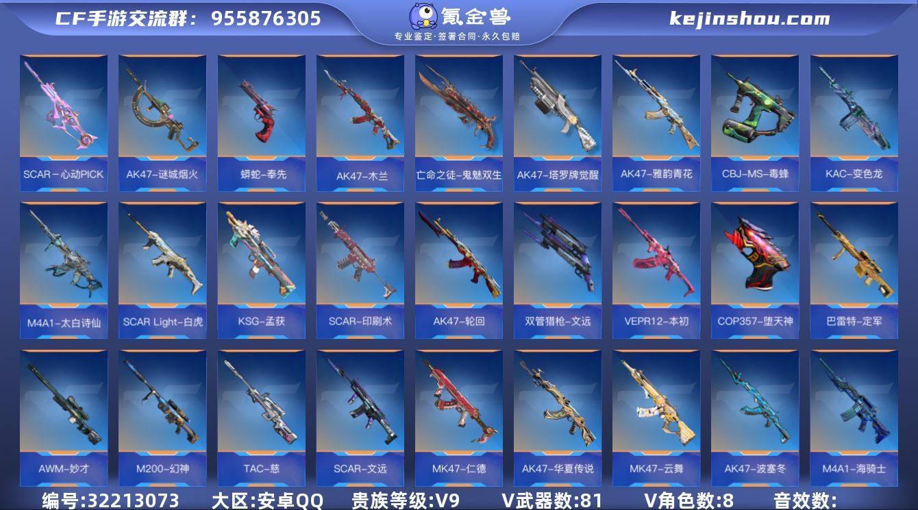 x1561 VIP9,王者武器21,英雄级武器346,万化664,角色62 【王者武器】:心至尊/魄至尊/王者之心/王者之影/王者之翼/王者之魄-冠军珍藏/王者之兽/王者之狱/王者之烈/王者之蝶/王者之霆/王者之魂/王者之锋/王者之心手雷/王者之影闪光弹/王者之心闪光弹/王者之翼闪光弹/王者之势闪光弹/王者之影烟雾弹/王者之心烟雾弹/王者之翼烟雾弹/王者之势烟雾弹/烟雾弹-雷霆王者 ;【热门皮肤】:双持柯尔特-极光-清凉夏日/M4A1-雷神-不屈老兵/81式-光明之神-千变/沙鹰-修罗-诸神黄昏/火麒麟手雷-钰/巴雷特-极光-清凉夏日/AK47-无影-荣耀酷本/M4A1-黑骑士-现代金属/王者之狱-冰霜奇迹/M4A1-雷神-暗月/M4A1-雷神-荣耀蛮蛮/擎天觉醒-能量核心/黑武士手雷-能量核心/王者之翼闪光弹-HeartShot/沙鹰-修罗-能量核心/巴雷特-毁灭-星空/沙鹰-修罗-不屈老兵/左轮-竞界荣光-蜂鸟/屠龙-英雄战甲/王者之魂-HeartShot/M4A1-雷神-枪神之魄/M4A1-死神-不屈老兵/激光短刃-黑骑士-暗月/AK47-火麒麟-暗月/AK47-无影-暗月/AK47-火麒麟-能量核心/死神烟雾弹-暗月/QBZ03-湮灭-秘银/M4A1-黑骑士-海王/AK47-竞界荣光-蜂鸟/AWM-游骑兵-寒霜/AWM-天龙-魔神/沙鹰-无影-不屈老兵/巴雷特-极光-能量核心/CZ75-死神-马赛克/81式-光明之神-三足金乌/AK47-火麒麟-雷掣战翼/AWM-天龙-英雄战甲/丈八蛇矛-怒魔/龙啸-英雄战甲/王者之心闪光弹-HeartShot/王者之锋-冰霜奇迹/虎贲钩镰刀-过载/黑骑士手雷-能量核心/火麒麟烟雾弹-能量核心/M4A1-死神-秘银/巴雷特-极光-不屈老兵/AK47-无影-不屈老兵/M4A1-黑骑士-瑞兽/AK47-火麒麟-雷神/MK5-机械纪元-蚀刻战甲/AK47-血武士-甲骨文渊/M4A1-雷神-时空幻境/火麒麟烟雾弹-寒霜/屠龙-星空/AK47-火麒麟-诸神黄昏/AK47-华夏传说-起源/龙啸-魔神/AK47-火麒麟-心动糖果/黑骑士烟雾弹-能量核心/双管猎枪-黑骑士-诸神黄昏/M4A1-死神-机...