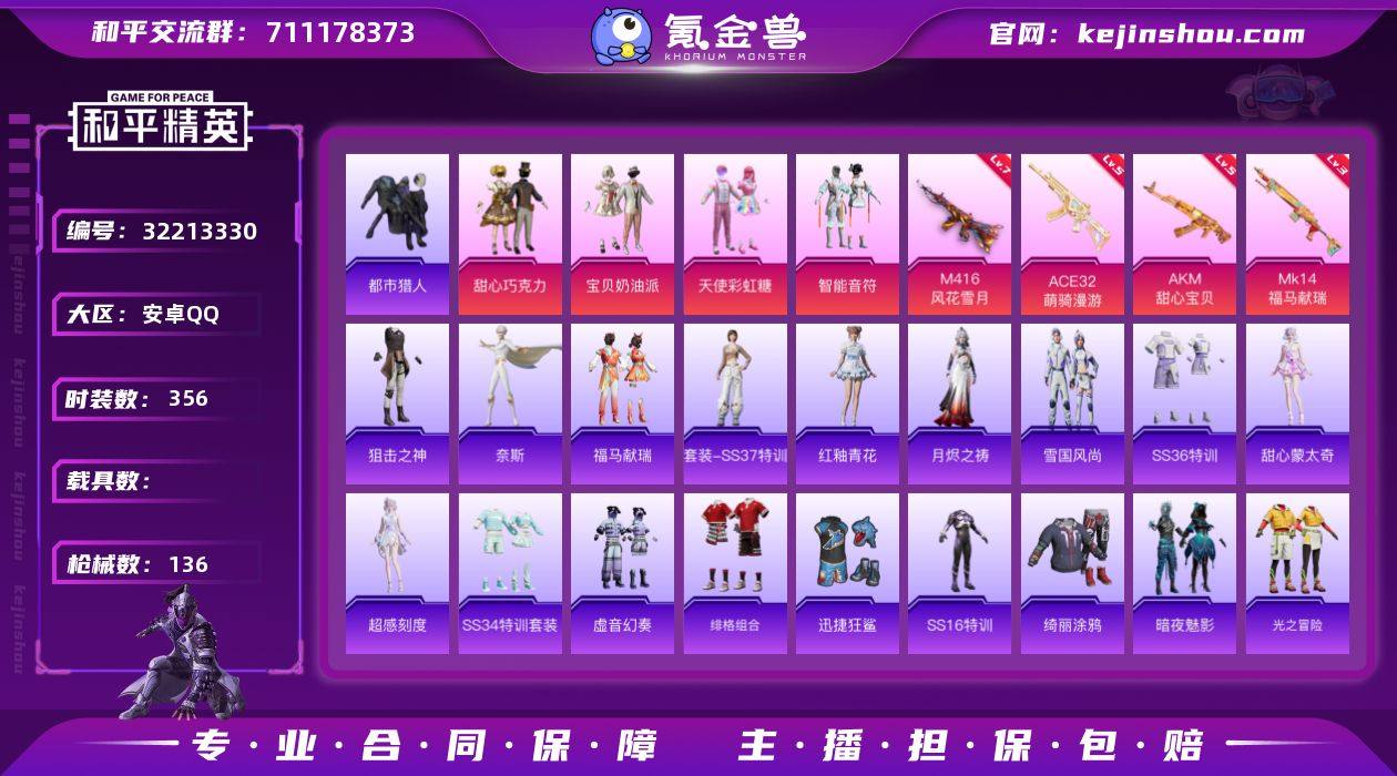 实名:可二次实名 是否支持人脸包赔:支持 粉装数量:4 特效枪数量:4 时装数:356 枪械数:136 都市猎人 宝贝奶油派,天使彩虹糖,甜心巧克力,智能音符 七级M416-风花雪月,五级ACE32-萌骑漫游,五级AKM-甜心宝贝,三级MK14-福马献瑞 狙击之神,奈斯,福马献瑞,红釉青花,SS37特训,雨过天青,月烬之祷,雪国风尚,SS36特训,超感刻度,甜心蒙太奇,SS34特训套装,暗夜魅影,暗夜之虎,冰川特警,冰冻风暴,暴风机械师,北国孤狼,白色伏地魔,长空猛禽,潮流游乐家,春日漫步,呆萌铁蟹,都市猎人,飞驰魅影,绯格组合,疯狂小兔子,福星高照,格斗先锋,光之冒险,幻彩翩翩,海岛探路者,虎虎生威吉莉,湖蓝色名流,黑色伏地魔,黄色名流,黄色运动,幻世战舞者,竞技名士,街头潮人,街头风暴,军械专家,科技之星,空投萌叽,黎明保卫者,蓝色运动,漫步者,猛禽,妙红点点,魅力单车,麻辣教官,懵萌河马,萌趣颜团子,牛气满满,破蛋小黄鸡,青春冒险家,绮丽涂鸦,青涩年华,瑞龙福将,软萌银虎,时空追击者,深蓝色名流,神气柴柴,SS14特训,SS15特训,SS16特训,SS17特训,SS19特训,SS20特训,SS22特训,甜心亚梦,团圆交子,特种颜团子,迅捷狂鲨,炫蓝之夏,星梦畅游,夏日音浪,虚音幻奏,荧惑魅影,音速流光,鹰眼刺客,治愈之星 绝对恒星降落伞,烈焰拳霸降落伞,甜心宝贝降落伞,银刃赛罗降落伞 卖家说:上赛季无敌战神,活跃礼包还有7000点卷,是自己的一手号,最近需要急用钱了