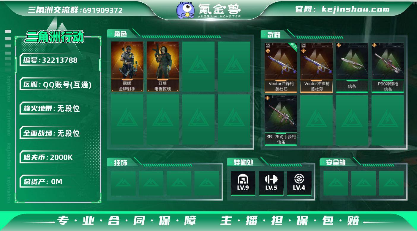 ABC10960/QQ区/【总资产:344M+哈夫币:200W+近战武器-信条+Vector冲锋枪-美杜莎(优品C)+红狼电锯惊魂+露娜金牌射手+】武器皮肤71;烽火60级:钻石Ⅴ,战场:军士长Ⅰ,【安全箱】高级安全箱;【特勤处等级】仓库LV.9,靶场LV.4,训练中心LV.6,收藏室LV.2,潜水中心LV.3;【捆绑包1】信条捆绑包;【干员皮肤2】红狼电锯惊魂,露娜金牌射手;【典藏皮肤】Vector冲锋枪-美杜莎(优品C);【近战皮肤】近战武器-信条,近战武器-黑鹰;【步枪皮肤】SG552突击步枪-运动员,M7战斗步枪-百步穿杨,SCAR-H战斗步枪-囚徒,G3战斗步枪-流沙送葬,ASVal突击步枪-百步穿杨;【冲锋枪皮肤】Vector冲锋枪-美杜莎,P90冲锋枪-信条,MP5冲锋枪-竞技风,Vector冲锋枪-百步穿杨;【射手步枪皮肤】SR-25射手步枪-信条;【狙击步枪皮肤】M700狙击步枪-百步穿杨,AWM狙击步枪-流沙送葬;【霰弹枪皮肤】M1014霰弹枪-暗鸦;【轻机枪皮肤】PKM通用机枪-蝮蛇;【挂饰9】黑夜猎手,赤霄游龙,黄金视野,窃风密探,挂饰-信条,挂饰-雪人,暗行哨兵,崩岩重炮;【载具17】防空车-原木,M1A4坦克-凝视,步战车-警戒线,步战车-钢铁洪流,防空车-钢铁洪流,轮式突击炮-钢铁洪流,GTQ35坦克-钢铁洪流,F45A战斗机-钢铁洪流,轮式突击炮-巅峰竞赛,GTQ35坦克-巅峰竞赛,侦察直升机-巅峰竞赛,突击直升机-巅峰竞赛,突击车-寒梅,轮式突击炮-寒梅,GTQ35坦克-寒梅,突击直升机-寒梅,F45A战斗机-夜间迷彩;【AW子弹】0;【货币】10三角币,165三角卷