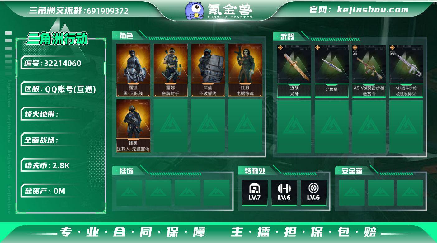 "Rs9705/QQ区/多典藏挂饰二刀皮一红皮二砖皮/总资产277/哈弗币2800W/【干员皮肤:红狼-电锯惊魂/蜂医-送葬人/深蓝-不破誓约/露娜-黑天际线/露娜-金牌射手】【刀皮:龙牙/北极星】ASVal-悬赏令(优品C)/M7战斗步枪-棱镜攻势S2(优品C)/【典藏挂饰:赤霄游龙/黄金视野/窃风密探/统统拿走/麦小鼠/牛角威龙】 "