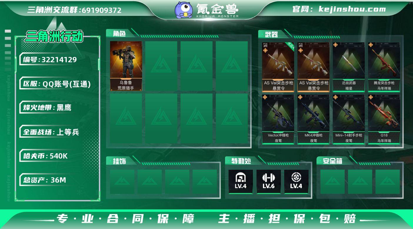 36m总资产-540k哈伏币-60烽火等级-黑鹰-18战场等级-上等兵【干员外观】:乌鲁鲁-荒原猎手【近战皮肤】:近战-暗星,近战-处刑者2级,近战-黑鹰【典藏外观】:AS Val突击步枪-悬赏令【典藏外观成色】:AS Val突击步枪-悬赏令(优品A)【传说外观】:K416突击步枪-行动记录,腾龙突击步枪-马年祥瑞,腾龙突击步枪-万金泪冠,MK47突击步枪-暗星,Vector冲锋枪-夜莺,SR-3M紧凑突击步枪-暗星,勇士冲锋枪-万金泪冠,MK4冲锋枪-夜莺,Mini-14射手步枪-夜莺,M14射手步枪-蛮荒,M14射手步枪-缄花,SR-25射手步枪-缄花,AWM狙击步枪-万金泪冠,.357左轮-缄花,G18-马年祥瑞【史诗外观】:勇士冲锋枪-檀劫铳影,K416突击步枪-腊梅,K416突击步枪-阿萨拉特攻,K437突击步枪-丛影谍踪,SR-3M紧凑突击步枪-开工大吉,勇士冲锋枪-丛影谍踪,MP7冲锋枪-六套之力,PKM通用机枪-蝮蛇,PKM通用机枪-阿萨拉特攻,M249轻机枪-丛影谍踪,M250通用机枪-囚徒,QJB201轻机枪-炽焰,VSS射手步枪-丛影谍踪, M14射手步枪-航天庆典,SV-98狙击步枪-猎鳄行动【稀有外观】:SV-98狙击步枪-海岸线,AUG突击步枪-千里骏骨,M4A1突击步枪-千里骏骨,野牛冲锋枪-千里骏骨,AS Val突击步枪-休闲时光*2,K416突击步枪-一帆风顺,SG552突击步枪-马年新春,SG552突击步枪-贴花艺术, AK-12突击步枪-马年新春,SCAR-H战斗步枪-荣耀列队,CAR-15突击步枪-来财,KC17突击步枪-来财,MP5冲锋枪-弄臣,SMG-45冲锋枪-行动开启,SMG-45冲锋枪-幻影结构,SR-3M紧凑突击步枪-马年新春,M249轻机枪-冰天雪地,QJB201轻机枪-哈夫克卫队,Mini-14射手步枪-来财,SR-25射手步枪-开拓,G18-星链科技,G18-哈夫克航天【普通外观】:AUG突击步枪-猛兽,腾龙突击步枪-古铜,M7战斗步枪-噬菌体,K437突击步枪-斑马,M4A1突击步枪-粉色涂装,M4A1突击步枪-高雅黑,QBZ95-1突...