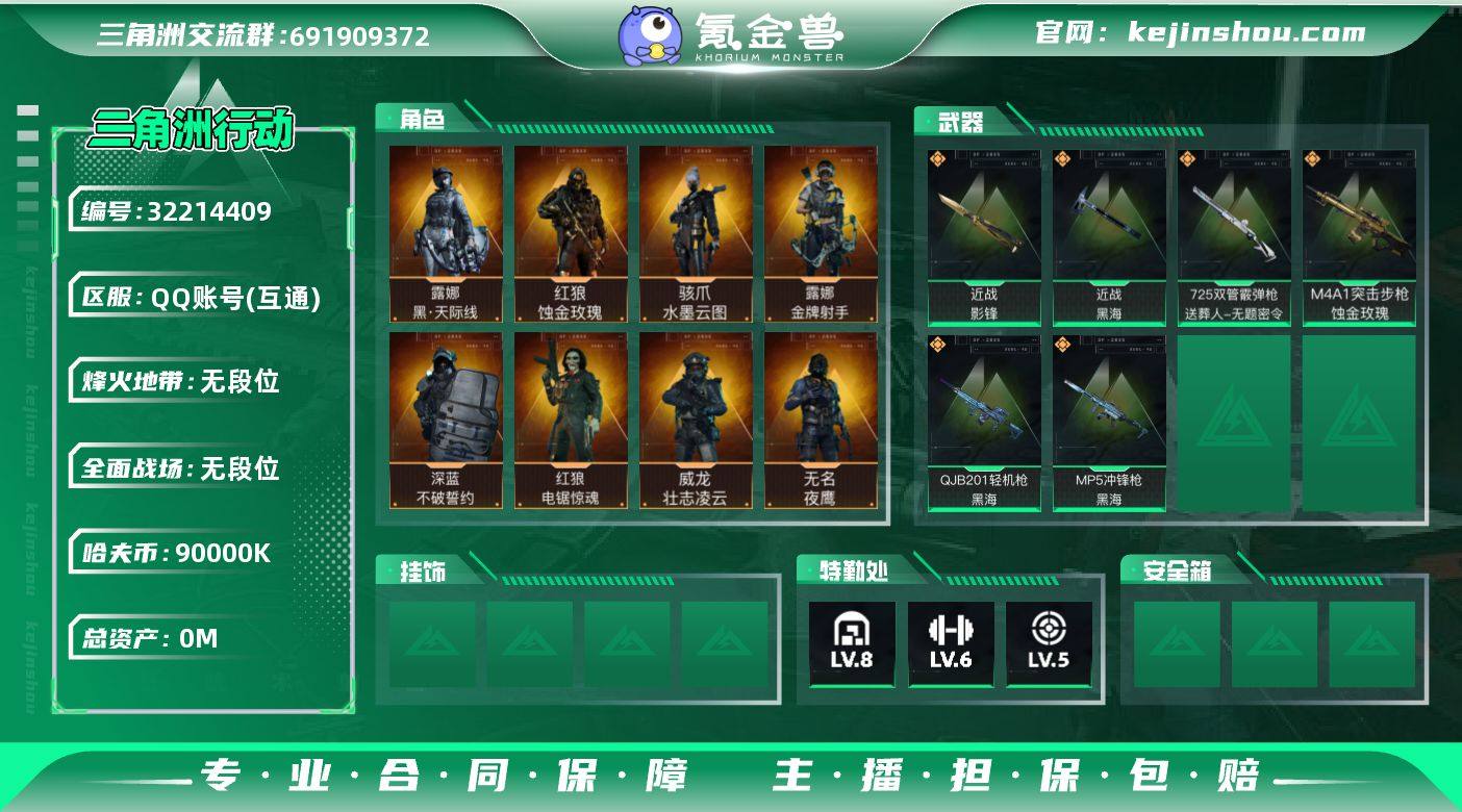 ABC11172/QQ区/不可二次/钱包无法注销/【总资产:361.8M+哈夫币:9027W+近战武器-影锋+近战武器-黑海+骇爪水墨云图+红狼蚀金玫瑰+露娜黑天际线+蜂医送葬人无题密令+威龙壮志凌云+无名夜鹰+红狼电锯惊魂+深蓝不破誓约+露娜金牌射手】武器皮肤320;烽火60级:三角洲巅峰,战场:上等兵Ⅲ,【安全箱】高级安全箱;【特勤处等级】仓库LV.8,靶场LV.5,训练中心LV.6;【捆绑包12】影锋捆绑包,黑海捆绑包,鹅鸭杀捆绑包,蚀金玫瑰捆绑包,水墨云图捆绑包,黑天际线捆绑包,电锯惊魂干员捆绑包,巳蛇捆绑包,特斯拉线圈捆绑包,捞点薯条捆绑包,曙光捆绑包,蝮蛇捆绑包;【干员皮肤9】骇爪水墨云图,红狼蚀金玫瑰,露娜黑天际线,蜂医送葬人无题密令,威龙壮志凌云,无名夜鹰,红狼电锯惊魂,深蓝不破誓约,露娜金牌射手;【近战皮肤】近战武器-影锋,近战武器-黑海,近战武器-黑鹰;【步枪皮肤】M4A1突击步枪-阿米娅,M4A1突击步枪-蚀金玫瑰,M4A1突击步枪-巳蛇,M4A1突击步枪-阿瑞斯之怒,AKM突击步枪-钢铁意志,ASh-12战斗步枪-鹅鸭杀,M7战斗步枪-巳蛇,SG552突击步枪-运动员,AK-12突击步枪-夜鹰,AK-12突击步枪-特斯拉线圈,SCAR-H战斗步枪-启航,SCAR-H战斗步枪-水墨云图,SCAR-H战斗步枪-铁艺苍穹,G3战斗步枪-骑士,CAR-15突击步枪-阿米娅,CAR-15突击步枪-黑鹰坠落,腾龙突击步枪-捞点薯条,KC17突击步枪-电锯惊魂,K416突击步枪-潜袭者,M4A1突击步枪-特勤执行,AKM突击步枪-林中猎手,QBZ95-1突击步枪-曙光,QBZ95-1突击步枪-ACE,ASh-12战斗步枪-守夜人,ASh-12战斗步枪-无极限,K416突击步枪-冬日风情,M16A4突击步枪-竞赛选手,AUG突击步枪-战术迷彩,AUG突击步枪-蝮蛇,AUG突击步枪-特勤执行,M7战斗步枪-百步穿杨,SG552突击步枪-尖端治疗,SG552突击步枪-深海恐惧,SG552突击步枪-哈夫克警备,SCAR-H战...