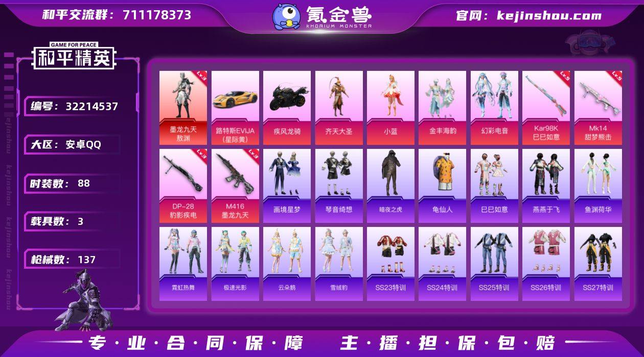 可二次【特价出售/店主推荐】 安卓 手Q-1神装-4粉装-7特效枪-3载具-3粉色飞行器-4.4w热力值-5王牌印记-88套装-137枪皮【红色神装等级】:墨龙九天-敖渊(三级)【热门品类】:套装-暗夜之虎,套装-龟仙人【粉色套装】:粉装-齐天大圣,角色-小蓝,粉装-金丰海韵,粉装-幻彩电音【粉色枪皮等级】:M416-墨龙九天(三级),AKS-74U-森灵之息(一级),Kar98K-巳巳如意(五级),Mk14-甜梦熊击(五级),Mk14-福马献瑞(一级),DP-28-豹影疾电(三级),PKM-萌骑夺宝(一级)【粉色载具】:路特斯EVIJA(星际黄),疾风龙骑,僚机-萌兔起飞【粉色飞行器】:天之羽翼飞行器,龙翔九天飞行器