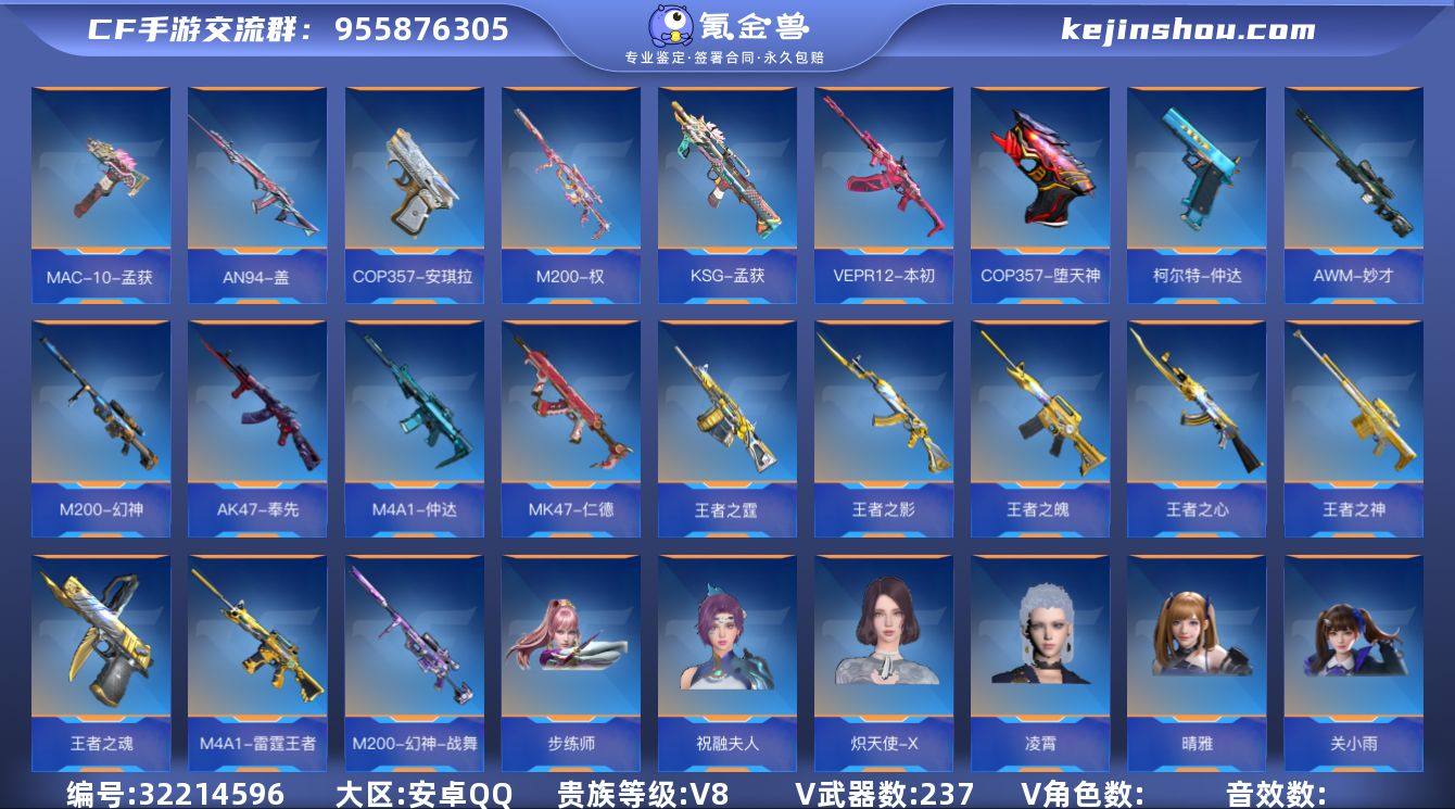 ABC9277/安卓qq/贵8/钱包注销/可转区/可二次/237V不重复/45角色/366万化/21王者武器/奉先套/无双/仁德套/仲达套/过载/妙才/权/幻神套/战舞/2COP/COP堕天神/COP安琪拉/盖/本初套/孟获套/王者之魄/王者之心/王者之影/王者之神/M12S雷霆王者/王者之霆/王者之魂/白金血钻/王者之竞手雷套/王者之兽手雷套/王者之影闪光弹/拉丝/王者之翼闪光弹/王者之心闪光弹/王者之影烟雾弹/王者之翼烟雾弹/王者之心烟雾弹/【角色】/步练师/炽天使X/凌霄/关小雨/祝融夫人/晴雅/樱/萝拉/零水下丽影/黑武士套/毁灭套/无影套/御龙套/天使套/冰封套/堕天神套/机械迷城套/风神翼龙套/木兰套/血月套/诗仙套/毒蜂套/天神套