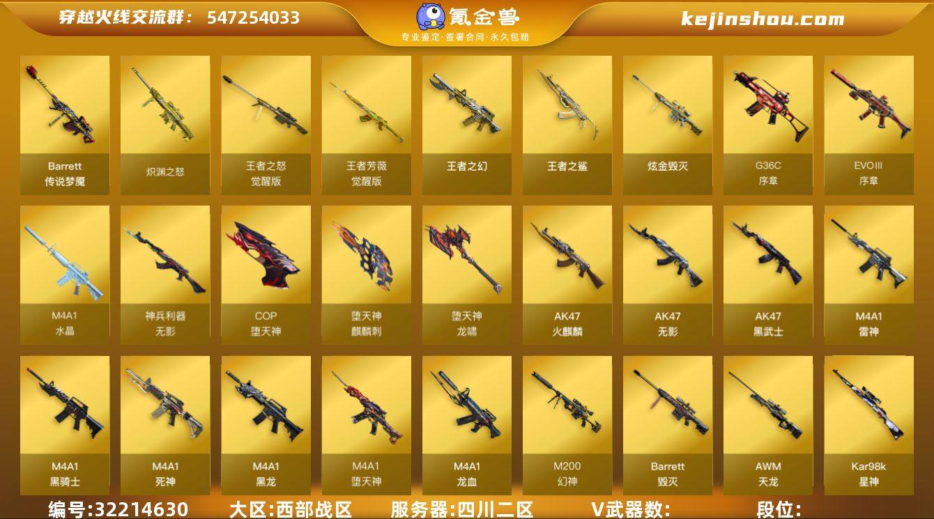 XH5813/西部/四川二区/【荣耀枪王11豆】/Lv.102 荣耀元帅/VIP6/103V/传说梦魇/幻神/幻神宠儿/幻神冠军之幻/星神/白虎/QBZ金色蔷薇/QBZ巅峰荣耀/QBZ天罚/王者芳薇/堕天神套/荣耀世冠柯尔特/柯尔特冠军之特/COP堕天神/USP神工天巧/*2/冠军之刃/六套堕天神手雷/四套神工天巧手雷/【生化】/5烈龙/炼狱/盘龙/迷你小刚/死亡之眼/【音效卡】/毁灭音效卡/雷神音效卡/黑龙音效卡/黑骑士音效卡/火麒麟音效卡/【枪皮】/毁灭冠军之怒/毁灭BEAN2020MVP/毁灭直播专属/雷神宠儿/雷神传奇N9/雷神荣耀之魄/雷神巅峰荣耀/雷神LGD/火麒麟传奇EVEN/龙啸冠军之啸/【四防角色】/王者春/王者葵惊若翩鸿/【其他角色】/修道士/女主播/葵/樱/迷迭香/王者零传说之路/【玩偶武器】/雷神精英刀锋/天龙曼陀罗/迷你深渊冰龙///各种饰品、道具/细节看图/【账号未封禁过十年】/