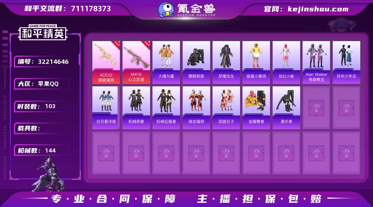 DYH18054苹果手Q-3特效枪-103套装-144枪皮-5王牌印记-不朽星钻Ⅰ-40075热力值【3特效枪】M416-心之恋语[7级],Mk14-福马献瑞[5级],ACE32-萌骑漫游[3级]【3稀有】M24-奇异狩猎者,S686-奇异狩猎者,汤姆逊-奇异狩猎者【2飞行器】红色滑翔尾迹,勇闯险境飞行服【2背包】神秘黑猫背包,古堡领主背包【241其它衣服和枪皮】鹰眼刺客,金耀舞者,冰川特警,鹤鸣,炫蓝之夏,空投萌叽,黄色伏地魔,蓝色守护者,SS16特训,破蛋小黄鸡,暗夜傀儡,狙击之神,镭射皇者,沙漠毒蛇,舞夜骑士,SS20特训,滨海假日,潮流游乐家,野性战魂,梦魇先生,苍穹猎鹰,黑色伏地魔,SS11特训,贵族骑装,甜蜜告白,极地朋克,瑞龙福将,SS17特训,虎虎生威吉莉,机械英豪,缤纷果语,元素星魂,深蓝色名流,漫步者,霓虹极客,SS36特训,音速流光,麻辣教官,红釉青花,牛气冲天,特种颜团子,SS12特训,SS15特训,牛气满满,萌黄之夏,探宝勇士,SS29特训,霓虹街区,灼焰舞者,甜蜜熊情侣,SS18特训,异彩先驱,原初圣火,SS19特训,吉莉礼服,萌趣咩咩,白月香洋装,雨过天青,夏日音浪,Alan Walker,冰川格斗者,白熊同盟,海上生明月,SS13特训,青春校园,玉兔迎春,SS37特训,特战英豪,老实芭蕉,完美偶像,粉红小猪,风行保卫者,团圆交子,SS9特训,冰冻风暴,SS10特训,风...
