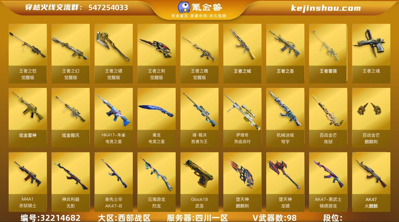 XH8935/西部/四川一区/【传奇2】/Lv.102 荣耀元帅/VIP6/98V/幻神/幻神电竞之星/QBZ金色蔷薇/朱雀电竞之星/白虎电玩蓝兔/6烈龙/3修罗/盘龙/*2/炼狱/毁灭极光/雷神/火麒麟/黑龙/王者之啸/屠龙/龙啸/两套雷暴手雷/两套堕天神手雷/【音效卡】/毁灭音效卡/黑骑士音效卡/火麒麟音效卡/烈龙云海游龙音效卡/碧霄极光音效卡/炼狱百战金芒庆典舞曲音效卡/【枪皮】/裁决运输船/雷神机甲刑天/黑骑士白马银枪/火麒麟传奇EVEN/【角色】/灵狐者黄金海岸/葵/樱/魅影/奇洋探员/修道士/云海玲珑/【玩偶武器】/雷神精英刀锋/C.A.T/天龙曼陀罗///各种饰品、道具/细节看图/【此账号未被封过十年】