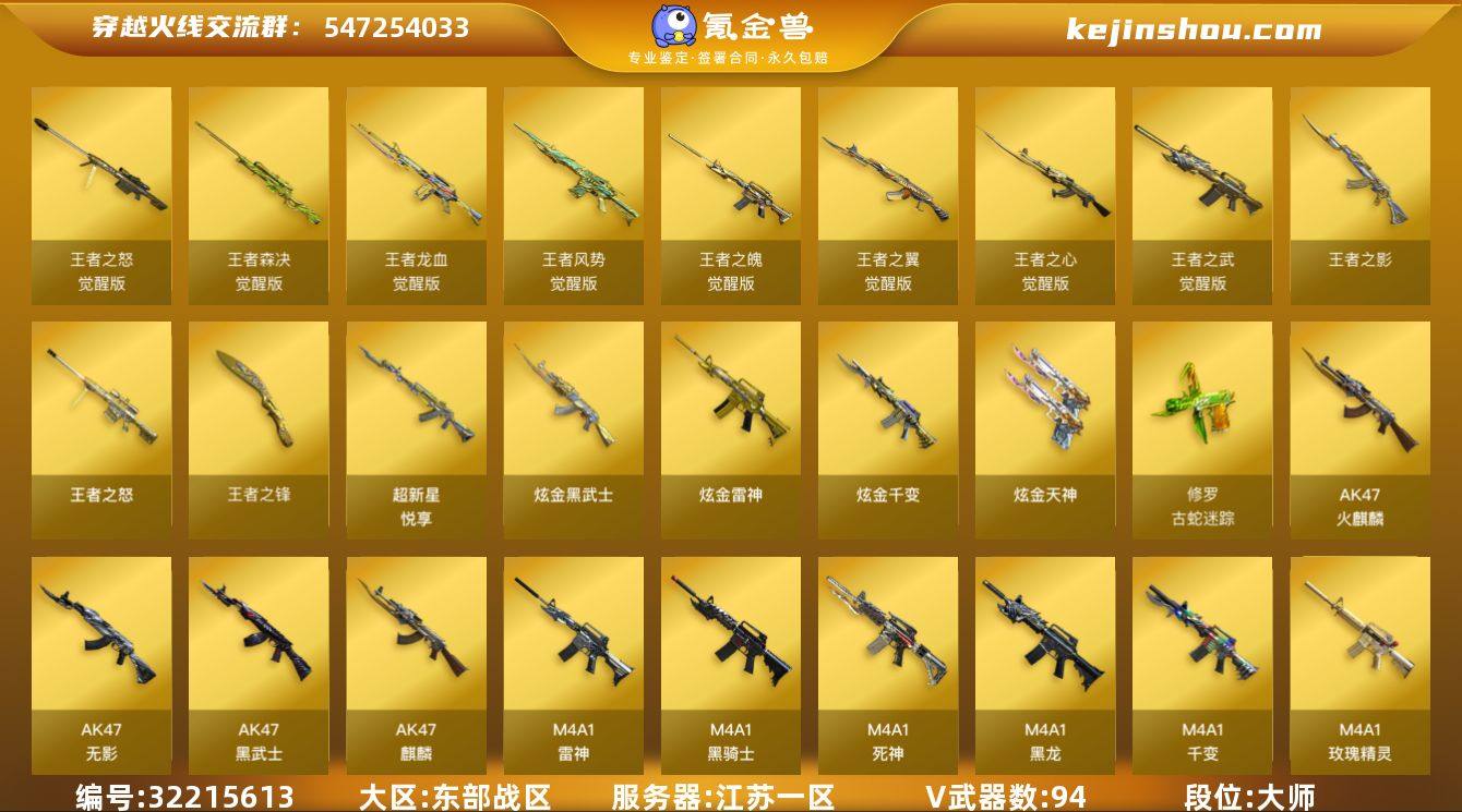 江苏一区-107V-17王者武器数-4炫金武器数 【热门武器】:QBZ03-金色蔷薇,M200-幻神,修罗-古蛇迷踪,M200-竞技荣光,白虎-电玩蓝兔,柯尔特-冠军之特,炼狱-迷你小钢,牛牛-AK47,M4A1-黑骑士,汤姆逊-烈龙*2,RPK-盘龙*3,加特林-炼狱*4,USP-雷暴,沙鹰-修罗*8 【王者炫金武器】:超新星-悦享,王者之影,王者之怒,王者之锋,炫金千变,炫金雷神,炫金武士,炫金天神,王者之魄高爆手雷*2,王者之魄闪光弹*2 【音效卡】:M200-幻神音效卡,M4A1-雷神音效卡,M4A1-黑骑士音效卡,Barrett-毁灭音效卡,Barrett-极光音效卡,QBZ03-金色蔷薇音效卡 【皮肤】:M200-幻神-黄忠皮肤,雷神-暗月,雷神-能量核心,雷神-荣耀之魄,M4A1-雷神-CFS 2019,雷神-虎将,M4A1-战神赵云,火麒麟-冠军之心,火麒麟-战神关羽,火麒麟-百城,毁灭-暗月,毁灭-荣耀之怒,毁灭-星空,毁灭-战神张飞,M4A1-千变-孔明皮肤,黑龙-能量核心,黑骑士-暗月,黑骑士-战神马超,黑骑士-伏羲,黑骑士-破界 皮肤,无影-能量核心*2,死神-秘银,天启-暗月*3,战神-粉色甜心皮肤,战神-流金岁月皮肤,AK47-B-常胜将军-曹操*2,AK47-B-常胜将军-刘备,天龙-能量核心,AWM-天龙-传奇白鲨,极光-能量核心,Barrett-金色蔷薇-蛇姬 皮肤,修罗-星空,天神-暗月,屠龙-荣耀之锋,龙啸-蛇姬 皮肤 【角色】:零,葵,樱,隼,审判者,王者樱-热浪之夏,王者-零,王者玲珑,王者-迷迭香,狐影,蛇隐宗,空,初恋灵狐,电竞少女,风暴女,嘉年华灵狐,娟娟,灵狐者-黄金海岸,灵狐者-七夕宝贝,灵狐者-职业经理,曼陀罗-X,玫瑰花神,潘多拉-X,蛇姬,铁骑荣耀,兔囡囡,樱-战斗天使,影武者-X 【人偶武器】:雷神-枪娘蕾安娜,炼狱-迷你小钢,牛牛-AK47,迷你生化手雷*2,生化手雷-机甲核心,迷你超能女侍 【暴走生化】:黑龙吞噬者,双面神,超级对讲机...