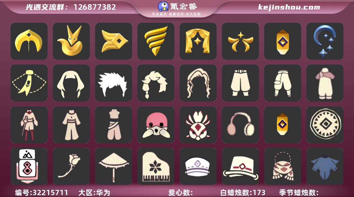 [16742038]华为 手机账号 4珍稀物品 8毕业季 6毕业图 173蜡烛 【珍稀物品】:白枭(帝企鹅发),玫瑰花,透明蝶翼斗,鳐鲲斗篷 【季节已毕业】:圣岛季,小王子季(王子季),风行季,潜海季,表演季,欧若拉季(欧若拉),追忆季,夜行季 【完成地图】:晨岛,云野,雨林,霞谷,墓土(暮土),禁阁 【礼包】:新年裤(瑞气服饰),蝴蝶结(大蝴蝶结),巫师(巫师帽),绊爱(绊爱斗篷)(绊爱礼包),橘子(大橘大利),贝壳(贝壳发饰),兔子(玉兔头饰)(玉兔发饰)(兔子发饰),星月头饰(星月头冠),彩虹耳机,鹿角(圣诞鹿角),创始人(创始人斗篷),围巾(小王子斗篷)(小王子围巾),福娃(福娃礼包)(春之日礼包)(铜钱斗),蝙蝠套(蝙蝠斗篷)(南瓜头),蜘蛛斗(蛛丝斗篷)(蛛网斗篷),红伞(瑞气纸伞),灯笼(中秋灯笼),黄伞(夏日阳伞),秋千(情人秋千) 【裤子】:王子服(小王子套装),蓝绿裤(高领舞服),武士裤,背带裤,搓澡巾,击剑裤 【面具】:夜行毕业面具(棕熊面具),呼吸面具(潜水面具),黄眉企鹅面具,凤凰面具 【面饰】:红耳机 【项链】:围巾(肩带) 【发型】:小王子发型,单侧绑发(单边小辫),留辫蘑菇头,虚荣,若笠(箬笠) 【头饰】:平顶帽,行军锅头盔(六边锅帽子)(双耳锅帽子),羽毛发饰(多羽发饰) 【斗篷】:燕尾斗篷,黄色连帽披风(连帽斗篷)(斜边队长斗篷),粉红绒毛斗篷(绒毛斗篷),海洋斗 【配饰】:蓝色手碟(毕业手碟),鲲灯(追忆之书),相机(季卡相机),玫瑰花,雨伞,高音钢琴(白色高脚钢琴)