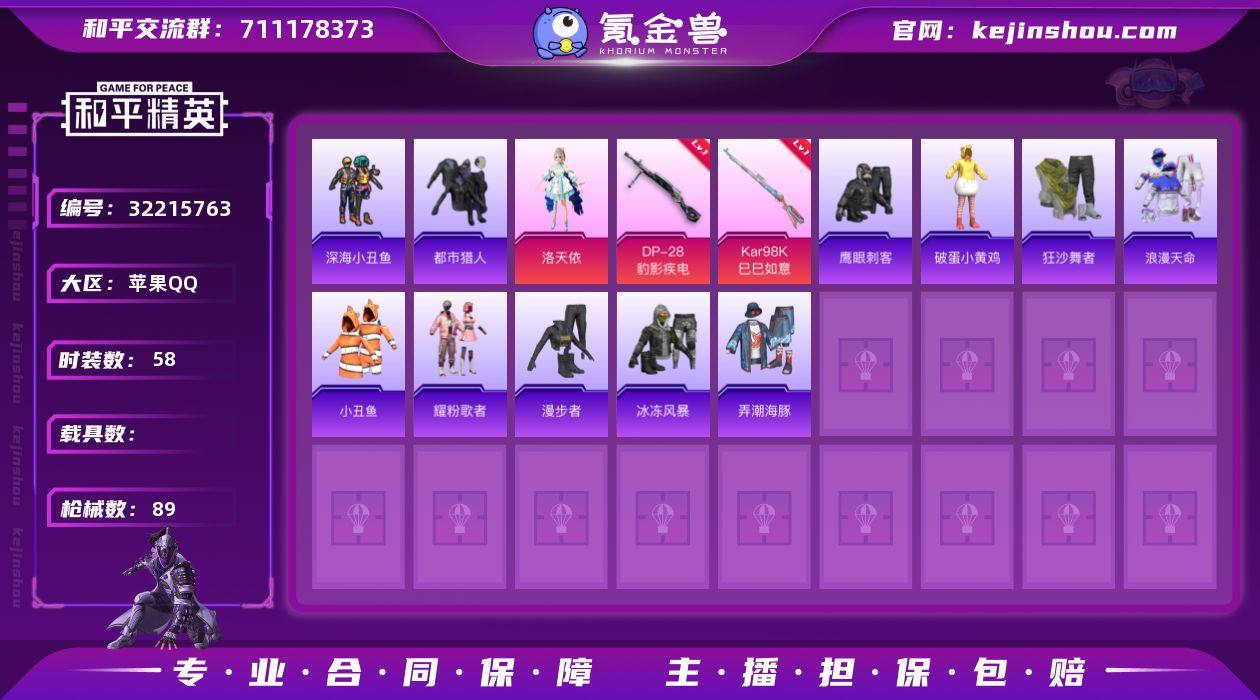 DSH2353【身法号2粉6特 都市猎人 浪漫天命 深海小丑鱼 狂沙舞者 洛天依】苹果手Q-2粉装-6特效枪-58套装-89枪皮-3王牌印记-卓越王牌7星-25093热力值【2粉装】角色-洛天依,角色-异瞳寒姬【6特效枪】Kar98K-巳巳如意[4级],M249-绝对恒星[4级],DP-28-豹影疾电[5级],Mk14-福马献瑞[5级],蜜獾-异瞳寒姬[6级],ACE32-萌骑漫游[4级]【5稀有】小丑鱼,浪漫天命,深海小丑鱼,狂沙舞者,都市猎人【8飞行器】登顶巅峰飞行器,鸡智如我飞行器,异域银装飞行器,炫彩糖果飞行器,绝对恒星飞行器,狂鲨锋刃飞行器,云朵驼驼飞行器,马上有福飞行器【1背包】甜心宝贝背包【134其它衣服和枪皮】魅力单车,福马献瑞,鹰眼刺客,大橘大利,炫彩糖果,角色-紫俏灵猫,SS35特训,冷焰舞者,秘语星愿,薄荷星砂,暖暖麦兜,萌鸡速递,完美偶像,雨过天青,荧光像素,街头潮人,破蛋小黄鸡,漫步者,青涩时光,绿洲幽影,SS36特训,弄潮海豚,SS34特训,街头风暴,书海巡游,青翼流星,狂鲨锋刃,粉黛兰香,长空猛禽,白糯汤圆,琴音绮想,黑色伏地魔,海岛探路者,冰冻风暴,荒原烈焰,雪国风尚,风迹短诗,红釉青花,错位像素,画境星梦,SS37特训,角色-超感刻度,阳光菠萝,马上有钱,角色-甜心蒙太奇,狙击之神,耀粉歌者,竞技名士,王牌教练,午间小调,蓝...
