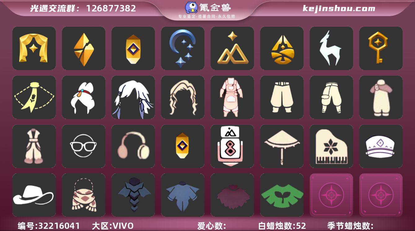 [16741977]VIVO 手机账号 2珍稀物品 8毕业季 6毕业图 52蜡烛 【珍稀物品】:白枭(帝企鹅发),彩虹围巾(五塑彩带斗) 【季节已毕业】:表演季,破晓季,追忆季,夜行季,拾光季,归巢季,九色鹿(九色鹿季),筑巢季 【完成地图】:晨岛,云野,雨林,霞谷,墓土(暮土),禁阁 【礼包】:兔子(玉兔头饰)(玉兔发饰)(兔子发饰),鹿角(圣诞鹿角),白绒金(白雪斗篷) 【裤子】:飞天裤(柔缎花边连)(九色鹿丝带裤),筑巢季·裤子(设计师长袍),武士裤,背带裤,搓澡巾 【面具】:夜行毕业面具(棕熊面具),黄眉企鹅面具 【面饰】:黑框眼镜(粗框眼镜),红耳机 【项链】:围巾(肩带) 【发型】:飞天盘发(九色鹿丸子头),虚荣,归巢毕业发型(五塑彩羽发),若笠(箬笠) 【头饰】:平顶帽,牛仔帽(西部帽) 【斗篷】:燕尾斗篷,遥鲲斗篷(双翼遥鲲斗),粉红绒毛斗篷(绒毛斗篷),冥龙斗篷,绿芽 【配饰】:鲲灯(追忆之书),相机(季卡相机),雨伞,筑巢季·小手办(光之子试衣),高音钢琴(白色高脚钢琴)