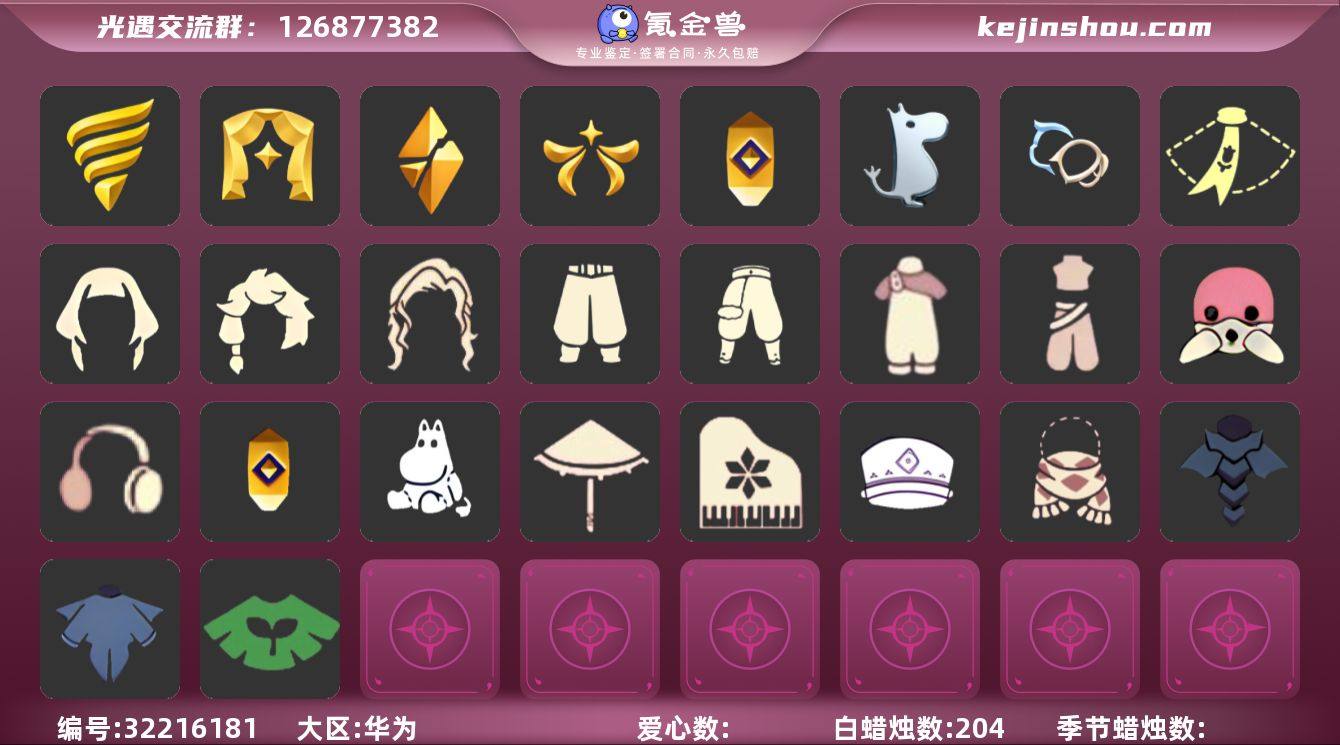 【礼包】:青衫落拓礼包,记忆水晶礼包,活力海牛礼包,兔子鞋(兔子拖鞋),新年裤(瑞气服饰),姆明饰品套装(姆明尾巴),奔跑发型(奔离远行发),巫师(巫师帽),绊爱(绊爱斗篷)(绊爱礼包),橘子(大橘大利),雪花(雪花发夹),贝壳(贝壳发饰),兔子(玉兔头饰)(玉兔发饰)(兔子发饰),四叶草(四叶草头饰),星月头饰(星月头冠),彩虹耳钉(彩虹耳饰),彩虹耳机,满月耳坠,鹿角(圣诞鹿角),欧若拉之翼,遥鲲披肩斗篷(披肩外袍),蜘蛛斗(蛛丝斗篷)(蛛网斗篷),瑞雪(瑞雪斗篷)(暖冬瑞雪),白绒金(白雪斗篷),人声乐器(欧若拉之声),红伞(瑞气纸伞),飞鸟纸伞,秋千(情人秋千)