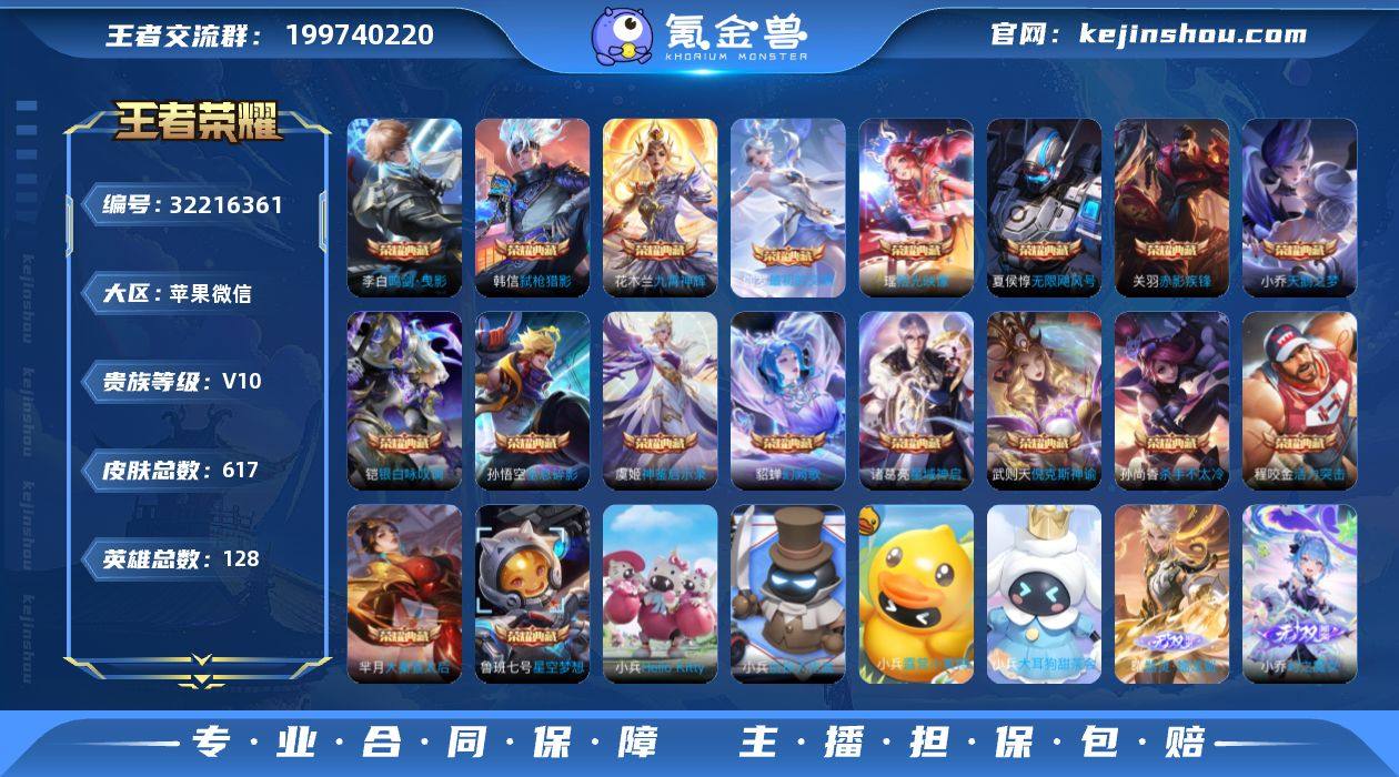 苹果V-有二次-V10(1127925分)-617皮-18典藏-有武则天-6无双 -3珍品传说-5小兵皮-105传说-15848场-197按键-【最新段位以实际为准,截图仅供参考】 【英雄全皮】:嬴政全皮,刘禅全皮,白起全皮,夏侯惇全皮,武则天全皮,露娜全皮,孙权全皮,娜可露露全皮,橘右京全皮,杨玉环全皮,女娲全皮,哪吒全皮,雅典娜全皮,东皇太一全皮,裴擒虎全皮,狂铁全皮,瑶全皮,盾山全皮,猪八戒全皮,曜全皮,鲁班大师全皮,澜全皮,阿古朵全皮,夏洛特全皮,司空震全皮,金蝉全皮,影全皮 【荣耀典藏】:武则天英雄,孙悟空全息碎影,武则天倪克斯神谕,夏侯惇无限飓风号,小乔天鹅之梦,孙尚香杀手不太冷,鲁班七号星空梦想,芈月大秦宣太后,程咬金活力突击,李白鸣剑曳影,诸葛亮星域神启,花木兰九霄神辉,关羽赤影疾锋,铠银白咏叹调,貂蝉幻阙歌,韩信弑枪猎影,虞姬神鉴启示录,瑶拾光映像,伽罗最初的交响 【无双皮肤】:曜器灵螭龙剑,甄姬雪境奇遇,小乔时之魔女,瑶真我赫兹,妲己青丘九尾,武则天神器明辉仪 【珍品传说】:安琪拉酷洛米之心,瑶大耳狗之梦,孙策时之奇旅 【传说皮肤】:后羿神树通天,曹操万灵伏威,杨玉环星之鸣奏,后羿千劫归真,司空震愿照山河定,女娲愿照千秋盛,妲己愿照众生和,澜愿照九州拓,蔡文姬愿照福禄聚,虞姬愿照岁时盈,云缨幻光神枪,裴擒虎祥瑞亨通,嬴政玄雷天君,王昭君映山客,夏侯惇霜北刀,孙尚香乘龙问璇玑,澜逐花归海,艾琳觅芳踪,露娜霜月吟,大乔时之奇旅,鲁班七号时之奇旅,兰陵王影龙天霄,吕布遇见神鼓,宫本武藏惊梅引,云缨鹤归松栖,上官婉儿妄想奇谈,马可波罗妄想实况,东皇太一灼幽烈阳,诸葛亮鹤羽星尊,澜电玩雷克斯,亚瑟追逃游戏,安琪拉追逃游戏,张飞百相守梦,公孙离记忆之芯,夏洛特浮生妄,干将莫邪画中仙,花木兰燃星之曲,虞姬无限倾心,项羽...