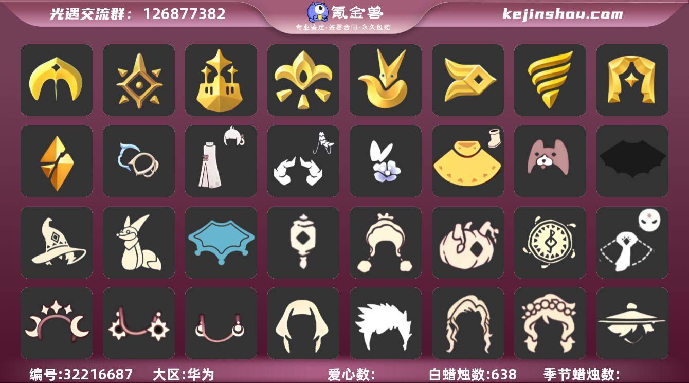 蜡烛数量:335 爱心数量:113 季节蜡烛数量:26 翼数量:160 预言季,梦想季,集结季,小王子季,风行季,潜海季,表演季,破晓季 织光季花瓣斗篷,紫色披肩斗篷,毛绒披肩斗篷,哥特斗篷,瑞雪斗篷,领主红斗篷,冥龙斗篷,遥鲲长斗,黑暗花斗篷,遥鲲短斗篷,半边围巾斗篷,遥鲲斗篷,红绒斗篷,白绒斗篷,花瓣斗篷,粉色花瓣斗篷,鲲斗,白鸟斗,黑金,白金,红金,圣诞斗,万圣斗,彩虹斗,樱花斗,白底tgc 丝滑短发,袍帽发型,中分长发,禁阁指甲盖发型,平菇发型,迁徙鳐语者发型,迁徙钟匠发型,雨妈发型,遥鲲飞翼发型,郡主发型,帽匠绅士发型,留辫蘑菇头,古典长发,冥龙长辫,皇冠水母头,遥鲲长辫,小王子发型,卷发,王冠,小丑头套,音乐家发型,飒爽束发,绿带麻花辫,双侧绑发,侠客头,编制头巾,公主头,脏辫发型,水母头发型,总裁发型,长发脏辫,归巢毕业发型,女生短发,三束绑发,渔夫马尾圆帽,半边脏辫绑发,白枭,咖喱,公主,蝴蝶结,正太,书虫,粗辫,虚荣,花环,若笠,明制,樱花,猫耳,女巫,虎狮 风行毕业裤子,武士裤,搓澡巾,紧身裤,毛靴裤,雪人裤,王子服 牛头面具,白鸟面具,阿努比斯,红狐狸,黄鼠狼,矮人面具,黑脸,兔头,玫瑰花面具,彩妆面具 飘带耳坠,蒙眼面巾 冥龙号角,双人沙滩躺椅,篝火,玫瑰花,雨伞,笛子,吉他,排箫,烟花棒,圣诞椅,气球,坐垫,火炬 皇冠 优雅领结,破晓季节项链,小王子季节项链,黑色领巾,表演季节项链,集结季节项链,风行季节项链,围巾,风行毛领,海龟项链 芭蕾鞋 秋千,瑞雪,tgc 卖家说:圣岛到九色鹿季阿努比斯白枭多礼包 光遇华渠标价出 圣岛季 有卡(打钩=毕业) 预言季 阿努比斯狗头面具✓ 梦想季 凤凰斗✓ 集结季 破烂斗✓ 小王子季 小玫瑰✓ 风行季 毕业裤子✓ 潜海季 潜水面具✓ 表演季 白枭头✓ 破碎季 冥龙斗篷✓ 欧若拉季 半毕业 缅怀季 有卡 九色鹿季 半毕业 礼包有姆明耳朵尾巴套装,蜘蛛斗,巫师帽,瑞雪斗篷,白雪斗篷,暖冬围巾斗,粽叶斗,红脸蛋福娃套装,荷叶伞,秋千,水晶球,奥利奥抱枕,鹿角,彩虹耳机,优雅领巾,祥云瑞气裤,星月发饰,远奔头等等。 光遇华为渠道服全活未设置,标价出。身高普高。