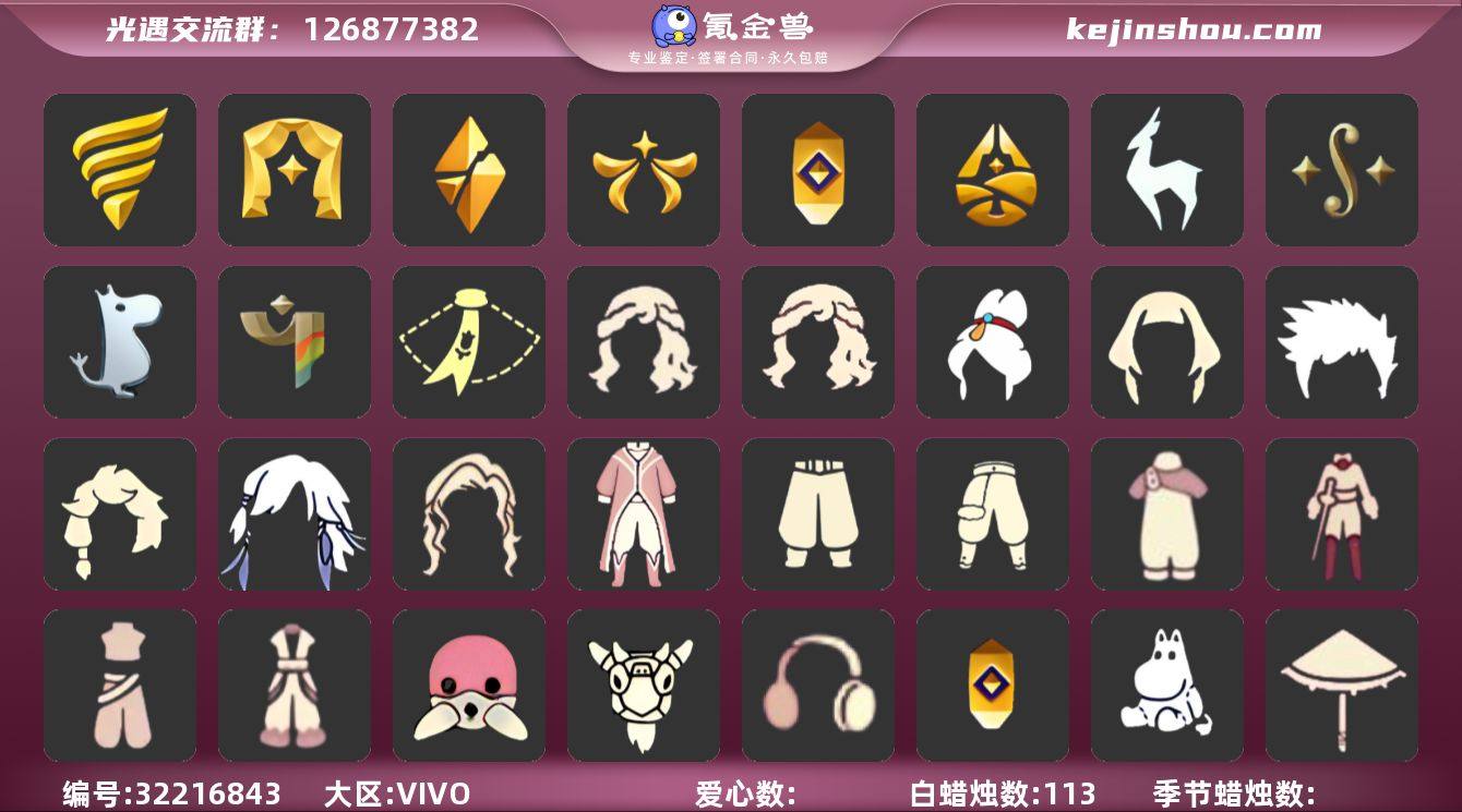 [16743469]VIVO 手机账号 3珍稀物品 10毕业季 6毕业图 113蜡烛 【珍稀物品】白枭(帝企鹅发),透明蝶翼斗,彩虹围巾(五塑彩带斗) 【季节已毕业】潜海季,表演季,破晓季,欧若拉季(欧若拉),追忆季,归巢季,九色鹿(九色鹿季),二重奏季,姆明季,彩染季 【完成地图】晨岛,云野,雨林,霞谷,墓土(暮土),禁阁 【礼包】青衫落拓礼包,线框斗篷礼包(周年线框斗篷),爱心眼镜,水母(水母肩饰),姆明饰品套装(姆明尾巴),奔跑发型(奔离远行发),海蓝波浪发型(海洋发型),南瓜(冥龙南瓜),绊爱(绊爱斗篷)(绊爱礼包),橘子(大橘大利),雪花(雪花发夹),贝壳(贝壳发饰),兔子(玉兔头饰)(玉兔发饰)(兔子发饰),四叶草(四叶草头饰),星月头饰(星月头冠),九色鹿角(神鹿祝福头饰)(神鹿祝福礼包),新年耳钉(金鳞耳饰),彩虹耳机,创始人(创始人斗篷),吉他(音韵吉他)(白吉他),小提琴(凯旋提琴),献瑞折扇礼包,秋千(情人秋千),大铁头,小狗周年发饰(小狗周年头饰) 【裤子】青鸟尊贵蓬头裤子(蓝色燕尾服),飞天裤(柔缎花边连)(九色鹿丝带裤),妮妮裙子(妮妮长裙),蓝绿裤(高领舞服),武士裤,背带裤,搓澡巾,击剑裤 【面具】呼吸面具(潜水面具),黄眉企鹅面具,辉光羚羊面具 【面饰】红耳机 【项链】围巾(肩带) 【发型】小王子发型,单侧...