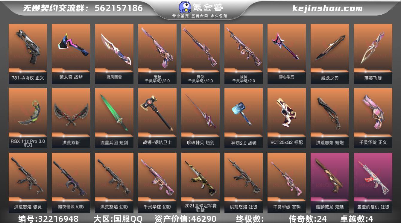 皮肤资产价值:46290 已用源晶点数:1000 流风回雪-千灵华绽//2.0,威龙之刃-耀鳞威龙,短剑-流星兵团 爪刀-RGX 11z Pro 3.0 短剑-珍珠棘贝 蒙太奇 战斧,神罚2.0 战锤,战锤-钢轨卫士 落英飞旋-千灵华绽 碎心裂刃,洪荒双斩-洪荒怒焰 幻影-黯夜怪谈,幻影-洪荒怒焰,幻影-千灵华绽,狂徒-2021全球冠军赛,狂徒-洪荒怒焰,狂徒-盖亚的复仇,狂徒-海洋之星,超集系统 狂徒,风暴之子 戍卫,幻影-甜心猎手,幻影-战术小伙伴,幻影-珍珠棘贝,狂徒-钢轨卫士,狂徒-幻心猎手,狂徒-流星兵团,獠犬-复古浪潮,獠犬-战术小伙伴,獠犬-诛心猎手,蒙太奇 幻影,戍卫-战术熊与伙伴们,戍卫-钢轨卫士,戍卫-甜心猎手,戍卫-珍珠棘贝 骇灵-洪荒怒焰,蜂刺-纤云弄巧,蜂刺-战术小伙伴,蜂刺-深海水族,蜂刺-甜心猎手,骇灵-光导纤维,骇灵-流星兵团,骇灵-珍珠棘贝,蒙太奇 骇灵 战神-千灵华绽//2.0,奥丁-流星兵团,奥丁-战术小伙伴,奥丁-诛心猎手,蒙太奇 战神,战神-深海水族 莽侠-千灵华绽//2.0,冥驹-千灵华绽,冥驹-堕天遗武,超集系统 飞将,风暴之子 冥驹,飞将-光导纤维,飞将-战术熊与伙伴们,冥驹-复古浪潮,冥驹-诛心猎手,莽侠-深海水族,莽侠-甜心猎手,莽侠-纤云弄巧 正义-781-A协议,鬼魅-千灵华绽//2.0,标配-VCT25xG2,短炮-洪荒怒焰,正义-千灵华绽,鬼魅-耀鳞威龙,标配-超能偶像,标配-光导纤维,标配-战术熊与伙伴们,超集系统 标配,短炮-钢轨卫士,短炮-深海水族,短炮-甜心猎手,短炮-纤云弄巧,风暴之子 正义,鬼魅-光导纤维,鬼魅-幻心猎手,鬼魅-流星兵团,狂怒-钢轨卫士,狂怒-战术熊与伙伴们,狂怒-珍珠棘贝,蒙太奇 狂怒,正义-复古浪潮,正义-纤云弄巧,正义-诛心猎手 风暴之子 雄鹿,雄鹿-复古浪潮 Clutch卡面,无畏契约GO!第一卷:零卡面,无畏契约GO!第一卷:奇乐卡面,无畏契约GO!第一卷:芮娜卡面,洪荒怒焰卡面,红鳞松叶卡面,虹吸式咖啡壶卡面,看镜头卡面,梦幻奶茶卡面,千灵华绽2.0卡面,千灵华绽卡面,情人节捷风卡面,势不可挡不死鸟卡面,势不可挡盖可卡面,声感陷阱设计图卡面,像素瞬间:深海明珠卡面,铁之华卡面,VCTxG2卡面,我眼中的世界卡面,耀鳞威龙卡面,终章:生意人麦宝卡面