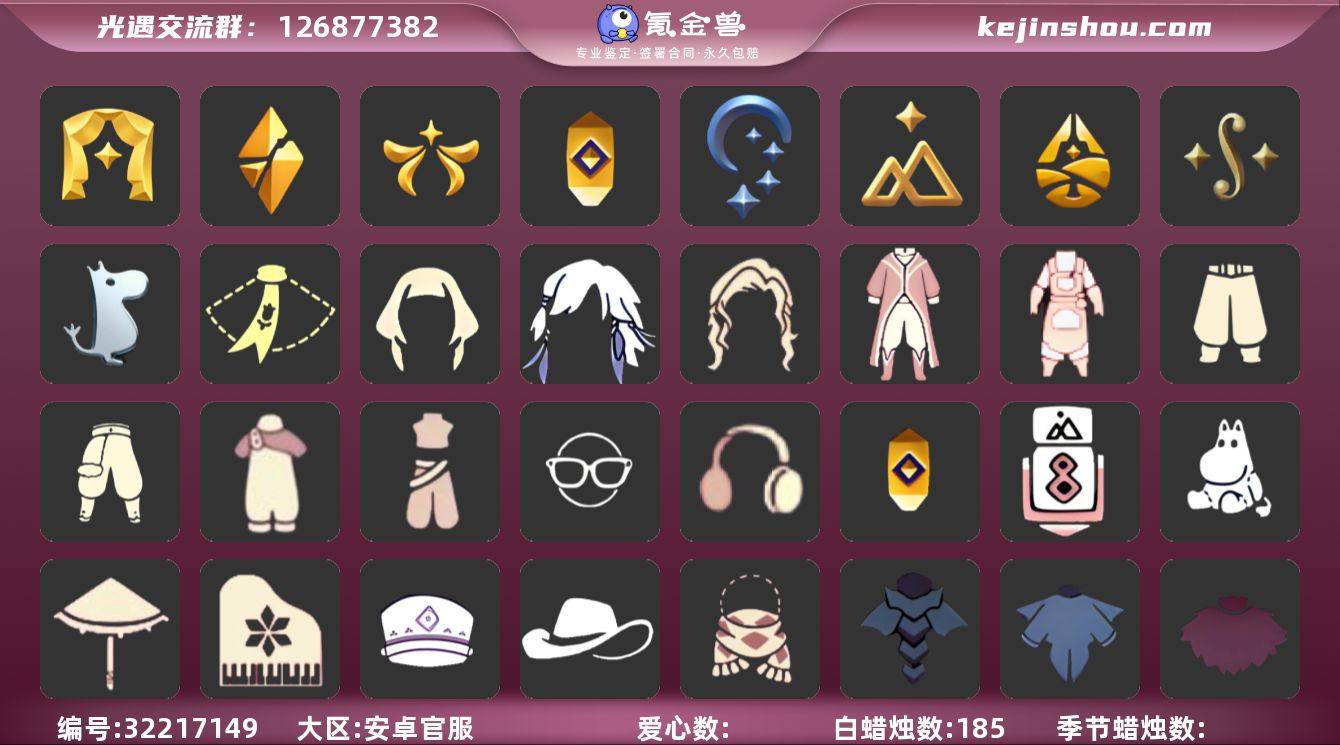 【礼包】青衫落拓礼包,线框斗篷礼包(周年线框斗篷),新年裤(瑞气服饰),伯爵面具(吸蟹伯爵)(吸蟹面具),蝴蝶结(大蝴蝶结),奔跑发型(奔离远行发),巫师(巫师帽),绊爱(绊爱斗篷)(绊爱礼包),橘子(大橘大利),贝壳(贝壳发饰),兔子(玉兔头饰)(玉兔发饰)(兔子发饰),四叶草(四叶草头饰),星月头饰(星月头冠),九色鹿角(神鹿祝福头饰)(神鹿祝福礼包),彩虹耳钉(彩虹耳饰),彩虹耳机,鹿角(圣诞鹿角),创始人(创始人斗篷),欧若拉之翼,福娃(福娃礼包)(春之日礼包)(铜钱斗),海龟斗篷,蝙蝠套(蝙蝠斗篷)(南瓜头),猫套(皮皮猫斗)(皮皮猫礼包),白绒金(白雪斗篷),吉他(音韵吉他)(白吉他),电吉他(周年电吉他),人声乐器(欧若拉之声),小提琴(凯旋提琴),红伞(瑞气纸伞),魔法棒(惊喜手杖)(仙女棒),黄伞(夏日阳伞),秋千(情人秋千),跷跷板(情人跷跷板),茶桌(花憩茶桌),茶壶(小憩茶桌),小船(情人小船)