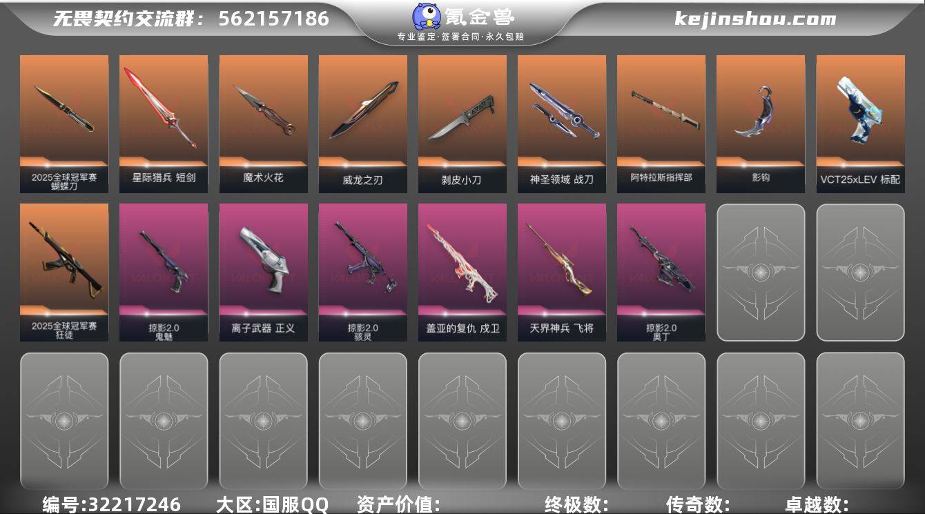 FH【25冠军狂徒加显卡爪都是精品】 【套装】:2025全球冠军赛套装,VCT 2025 赛季套装,耀鳞威龙套装 【英雄】:幻棱,炼狱,维斯,暮蝶,钛狐,壹决,铁臂,捷风,雷兹,幽影,不死鸟,贤者,猎枭,蝰蛇,零,芮娜,奇乐,尚勃勒,霓虹,斯凯,夜露,星礈,K/O,海神,盖可,黑梦,钢锁 【近战 武器】:近战武器-2025全球冠军赛 蝴蝶刀,近战武器-侦察力量 蝴蝶刀,近战武器-奇点//2.0 蝴蝶刀,近战武器-VCT 2025 爪刀,近战武器-威龙之刃,近战武器-流星兵团 短剑,近战武器-超限闪存 匕首,近战武器-盖亚之愠,近战武器-钢轨卫士 战锤,近战武器-荒土机兵 热能刀,近战武器-夜刃诡镰,近战武器-诡秘蛇影 军刀,近战武器-日耀风暴 遗器 【狂徒】:狂徒-2025全球冠军赛,狂徒-混沌序曲,狂徒-机动狂飙,狂徒-偃月苍龙,狂徒-噬影者,狂徒-RGX 11z Pro,狂徒-掠影,狂徒-盖亚的复仇,狂徒-日冕雄师,狂徒-耀鳞威龙,狂徒-紫阙金琅,狂徒-钢轨卫士,狂徒-荒土机兵,狂徒-流星兵团,狂徒-诡秘蛇影 【幻影】:幻影-源能者娱乐系统,幻影-异鳞魔蛇,幻影-超限闪存,幻影-纳米打击,幻影-战术小伙伴,幻影-末日之翼 【戍卫】:戍卫-天界神兵,戍卫-钢轨卫士,戍卫-浮光跃金,戍卫-逆冲蛮牛,戍卫-沙场老兵,戍卫-战术熊与伙伴们,戍卫-折光棱晶 【獠犬】:獠犬-模拟赫兹,獠犬-逆冲蛮牛,獠犬-战术小伙伴 【冥驹】:冥驹-归零者,冥驹-离子武器,冥驹-荒土机兵,冥驹-模拟赫兹 【飞将】:飞将-光导纤维,飞将-战术熊与伙伴们,飞将-末日之翼 【莽侠】:莽侠-超限闪存,莽侠-诡秘蛇影,莽侠-纤云弄巧 【战神】:战神-浮光跃金 【奥丁】:奥丁-流星兵团,奥丁-纳米打击,奥丁-战术小伙伴,奥丁-末日之翼 【判官】:判官-诡秘蛇影,判官-纳米打击x 【雄鹿】:雄鹿-模拟赫兹,雄鹿-逆冲蛮牛 【骇灵】:骇灵-光明哨兵//2.0,...