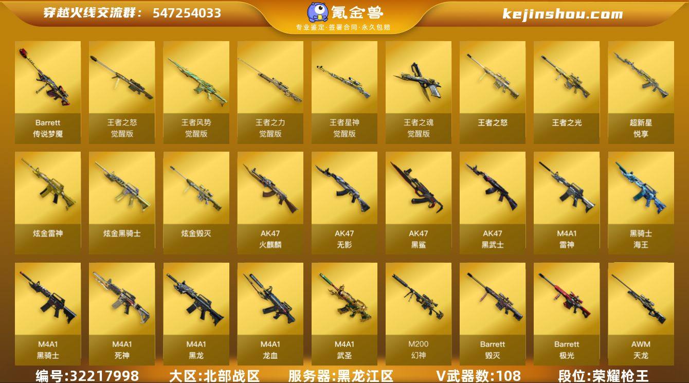 黑龙江区-119V-8王者武器数-4炫金武器数 【传说武器】:传说梦魇 【热门武器】:传说梦魇,QBZ03-金色蔷薇*3,M200-幻神,死亡之眼,M4A1-黑骑士*3,汤姆逊-烈龙*7,RPK-盘龙*4,加特林-炼狱*3,斯泰尔-蝴蝶,沙鹰-修罗*3 【王者炫金武器】:超新星-悦享,王者之光,王者之怒,炫金骑士,炫金雷神,炫金毁灭*2 【音效卡】:AK47-火麒麟音效卡*2,M4A1-雷神音效卡*2,M4A1-黑骑士音效卡*2,Barrett-毁灭音效卡*2 【皮肤】:雷神-暗月*2,雷神-星空*2,雷神-耀金皮肤,雷神-机甲刑天皮肤,火麒麟-雷神,火麒麟-华夏之心,火麒麟-百城,火麒麟-心动糖果,毁灭耀金皮肤,毁灭-星空,毁灭-黑大圣皮肤,毁灭-风暴,黑龙-能量核心,黑龙-暗月,黑骑士耀金皮肤,无影耀金皮肤,战神-粉色甜心皮肤,战神-紫绶金章皮肤,战神-流金岁月皮肤,AK47-B-常胜将军-曹操,AK47-B-常胜将军-刘备,AK47-B-常胜将军-孙权,极光-能量核心,炼狱-玩具枪皮肤,修罗-能量核心,屠龙-荣耀之锋 【角色】:葵,樱,电竞教官-云悠悠,机械姬,修道士,空,初恋灵狐,芳心审判者,娟娟,葵-赛博朋克,兰-新年限定,灵动武士,灵狐者-X,灵狐者-黄金海岸,灵狐者-七夕宝贝,龙儿,龙儿-小淘气,麻雀,曼陀罗-礼服,潘多拉-X,潘多拉-甜心教官,潜龙队-X,青霞仙子,斯沃特-X,蜀雪,铁骑荣耀,新娜塔莎,雪莉杨,樱-战斗天使,影武者-X 【人偶武器】:M4A1-雷神-精英刀锋,迷你生化手雷-救赎猎手,斯泰尔-蝴蝶,海滩汪汪-巴雷特,COP-旗袍,迷你深渊冰龙,迷你牛魔王,深渊终结者手雷,闪光弹-小乔,闪光弹-貂蝉,高爆手雷-大乔 【暴走生化】:死亡之眼,超级对讲机 【挑战大师】:AK47-冰龙粉碎者,冰龙粉碎者-白马银枪*2,激光毁灭者III-白马银枪,激光毁灭者III,神圣爆裂者-末日III 【英雄级武器】:AK47-火麒麟*3,M4A1-黑龙,M4A1-雷神*3,...