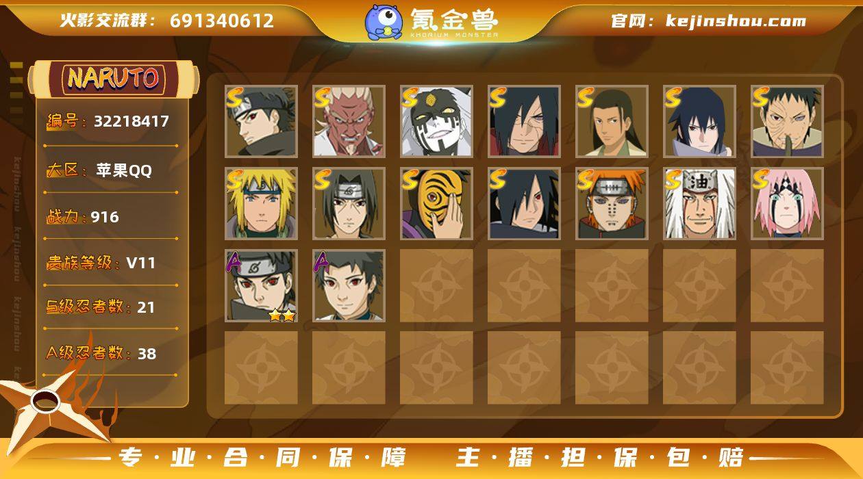 [17461618]V11 21S忍 38A忍 19通灵 916W战力 可二次 可修改实名 【S级忍者】宇智波止水「须佐能乎」,艾「忍界大战」,大筒木桃式,宇智波斑「秽土转生·解」,千手柱间·木叶创立,宇智波佐助「永恒万花筒」,神秘面具男 「红夜之刃」,春野樱 「忍界大战」,宇智波斑 「木叶创立」,宇智波带土 「忍界大战」,旗木卡卡西「须佐能乎」,大筒木舍人 「最终章」,自来也 「传说中的三忍」,漩涡鸣人 「暴怒·第六尾」,波风水门「九喇嘛连结」,漩涡鸣人·宇智波佐助,神秘面具男,宇智波鼬 「须佐能乎」,佩恩「天道」,波风水门,自来也