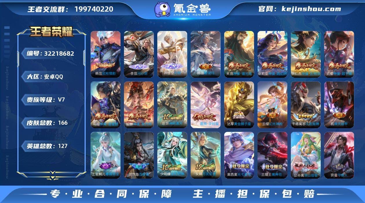【王者荣耀】珍品无双0 典藏1 无双2 珍品传说0 传说17 史诗50 英雄127 皮肤166 贵族7级 荣耀典藏:弑枪猎影__无双皮肤:无相|问心剑__传说皮肤:绛天战甲|久胜战神|黄金狮子座|孙尚香-末日机甲|马超-琥珀纪元|幻光神枪|愿照·岁时盈|神树通天|花木兰-异界灵契|神骥·镇沧海|神骥·鸣幻洲|神骥·赴朔漠|神骥·越千峰|神骥·逐星野|神骥·聚万邦|踏浪归__稀有限定:蔷薇恋人|李小龙|梁祝|大漠名商|高山流水|海滩派对|皇家上将|混沌棋|魔术师|千军破阵|驱傩正仪|沙漠行僧|万华元夜|无心|纤云弄巧|疑决卦|阴阳师|冰雪圆舞曲|大乔-猫狗日记|德古拉伯爵|电玩小子|鬼剑武藏|黄金分割率|箭羽风息|金属风暴|吕布-末日机甲|魅力维加斯|偶像歌手|奇遇舞章|水果甜心|水晶猎龙者|孙策-猫狗日记|晚萤|摇滚巨星|鹰眼统帅|幽灵船长|月团寄思|紫霞仙子|星界特工|霜北刀|海诺-心动手记|曙光守护者|千年之狐|心灵骇客|谧流熔炉|万物之道|绮世丹青|化蝶舞|原初探秘者|布丁狗之约|虚灵犬护|石田雨龙|逆浪荇歌|孙策-百相守梦|周瑜-百相守梦|赞萌露比|黄忠-百相守梦|守夜人|涂山容容|光弋星穹|傩神司|往忆晖光|荣光之誓|万灵启世|巫礼祀神|鹤鸣心笺|小乔-线条小狗|周瑜-线条小狗|百晓客|春霖将至__优质皮肤:创世神祝|孤猎|熊喵少女|激情绿茵|冰刃幻境|森|绯红之刃|踏雪寻梅|画中游|威尼斯狂欢|芝加哥教父|绝影神枪|幸存者|赤焰之缨|福禄兄弟|前尘|特种部队|范海辛|魇语军师|花见巫女|棒球奇才|帝国元帅|霓裳曲|加勒比小姐|修竹墨客|万圣前夜|瓷语鉴心|秘密基地|鲨炮海盗猫|虹云星官|守护之力|海滩丽影|阿尔法小队|兔女郎|死亡骑士|黄金武士|少女阿狸|玩偶对对碰|宫本武藏-未来纪元|忍·炎影|街头霸王|教廷特使|潮玩牛仔|拳王|白色死神|白执事|哥特玫瑰|西施-雪境奇遇|星梦巡礼|灵卦秘语|缤纷绘卷|掌控之力|龙腾万里|霸王丸|龙舞盛年|汉昭烈帝|乓乓大师...