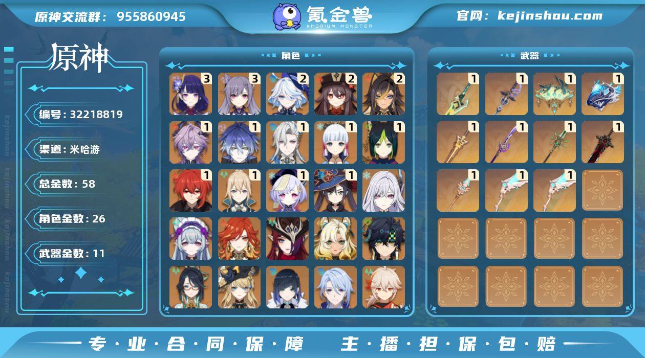 47人物黄,11武器黄,29角色黄,6把限定专武,1+1龙王,2+0水神,3+1雷神,1+0菲林斯,32个满突破角色,所有主c均有高练专属毕业套装