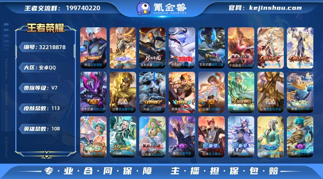 47322|精品脱坑典藏珍品无双多传说号 (1星传说 7个性按键) 低价出 安卓QQ 113皮 贵族7级 1典藏 2珍品传说 2无双 12传说 29史诗【荣耀典藏】弑枪猎影【珍品传说】黑崎一护,怪盗基德【无双限定】问心剑,器灵·螭龙剑【传说皮肤】神骥·镇沧海,千山共赴,神骥·安卓QQ 113皮 贵族7级 1典藏 2珍品传说 2无双 12传说 29史诗【荣耀典藏】弑枪猎影【珍品传说】黑崎一护,怪盗基德【无双限定】问心剑,器灵·螭龙剑【传说皮肤】神骥·镇沧海,千山共赴,神骥·逐星野,幻光神枪,愿照·山河定,地狱之眼,黄金白羊座,鸣野蒿,愿照·九州拓,祥瑞亨通,黄金狮子座,无双飞将【史诗皮肤】涂山容容,线条小狗,巫礼祀神,锁墨魂,百相守梦,破空之剑,无心,德古拉伯爵,魅力维加斯,暗夜贵公子,水果甜心,茶境仙,鬼剑武藏,地狱岩魂,幽灵船长,天秀·启明,龙之律动,绮世丹青,鹰眼统帅,魔术师,星夜王子,特工魅影,百相守梦,功夫厨神,李小龙,黄金分割率,皇家上将,器灵·浮梦炉,化蝶舞【勇者皮肤】荣光之誓,线条小狗,锦麟游梦,逆浪荇歌,鹤鸣心笺,踏浪烽翎,溯影追猎,极光幻客,克喵,班班快跑,噬灭天穹,死亡骑士,黄金武士,铁骨偃魂,浪漫序章,秘密基地,阿尔法小队,逐霄战戟,野性能量,暗都幽影,谧流熔炉,星梦巡礼,天穹之誓,沉稳之力,神迹守卫,万象初新,未来纪元,灵卦秘语,雾都夜雨,灵野札记,五福同心,魅影绮裳,玫蓝誓约,救世之瞳,景韶洛都,鲨炮海盗猫,时空谍影,阴阳师,潮玩探月行,幻想奇妙夜,花好人间,白色死神,敬我三分,星际陆战队,百相守梦,苍林狼骑,春野闲踪,雪境奇遇,忍·炎影,爆裂喵拳,大发明家,拳王,虚灵犬护,爱心护理,街头霸王,海滩派对,访茗客【其他皮肤】启蛰,伊势巫女,尼罗河女神,碧珀绯影,灼热之刃,绝影神枪,秩序猎龙将,激情绿茵,幸存者,福禄兄弟