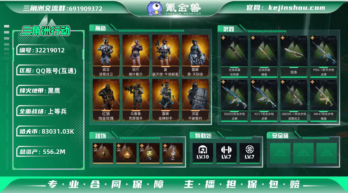 实名:不可二次实名 总资产:556.2M 哈夫币:83031.03K 烽火地带段位:黑鹰 烽火地带等级:60 全面战场段位:上等兵 全面战场等级:34 10级仓库,7级训练中心,7级靶场,6级指挥中心,3级潜水中心,3级防具台,3级工作台,3级制药台,3级技术中心,2级收藏室 战术部门等级:4 战斗部门等级:4 医疗部门等级:4 研发部门等级:4 后勤部门等级:4 曼德尔砖-气象感应:0 曼德尔砖-命运王牌:0 曼德尔砖-电玩高手:0 曼德尔砖-美杜莎:0