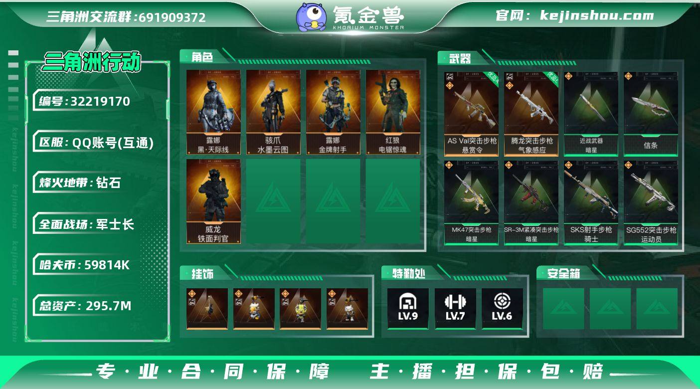 实名:不可二次实名 总资产:295.7M 哈夫币:59814K 烽火地带段位:钻石 烽火地带等级:60 全面战场段位:军士长 全面战场等级:50 9级仓库,7级训练中心,6级靶场,5级指挥中心,1级潜水中心,3级防具台,3级工作台,3级制药台,3级技术中心,2级收藏室 战术部门等级:3 战斗部门等级:2 医疗部门等级:3 研发部门等级:2 后勤部门等级:2 曼德尔砖-气象感应:0 曼德尔砖-命运王牌:0 曼德尔砖-电玩高手:0 曼德尔砖-美杜莎:0