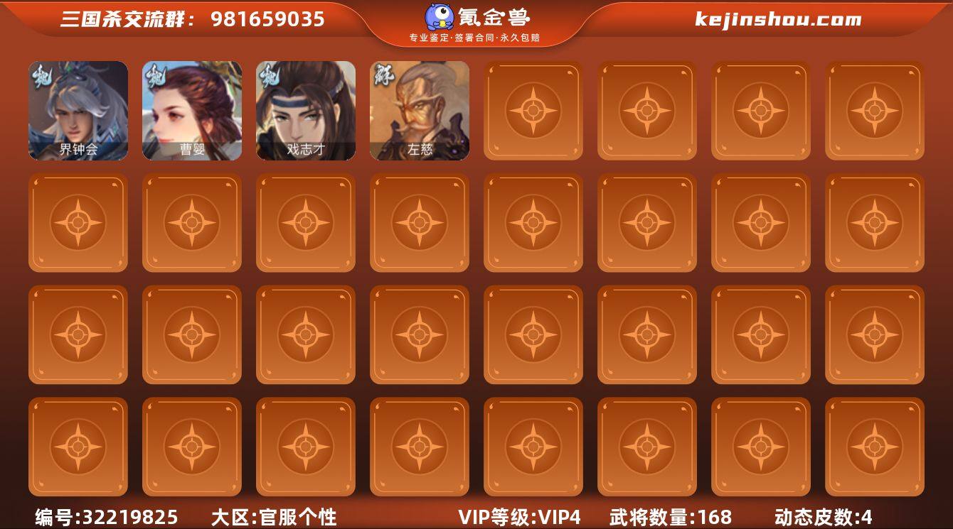 【1262】官阶:先锋将军;VIP等级:VIP4;史诗武将数量:4;动态皮肤数量:4;武将总数:168;史诗宝珠数量:0;将魂数量:1485;神将:1;魏国史诗武将:4;蜀国史诗武将:0;吴国史诗武将:0;群史诗武将:1 神吕蒙,界钟会,曹婴,戏志才,左慈,曹丕-龙年中秋(动态),界曹植-鼠年端午(动态),周处-义除三害(动态),陶谦-安民护祚(动态)