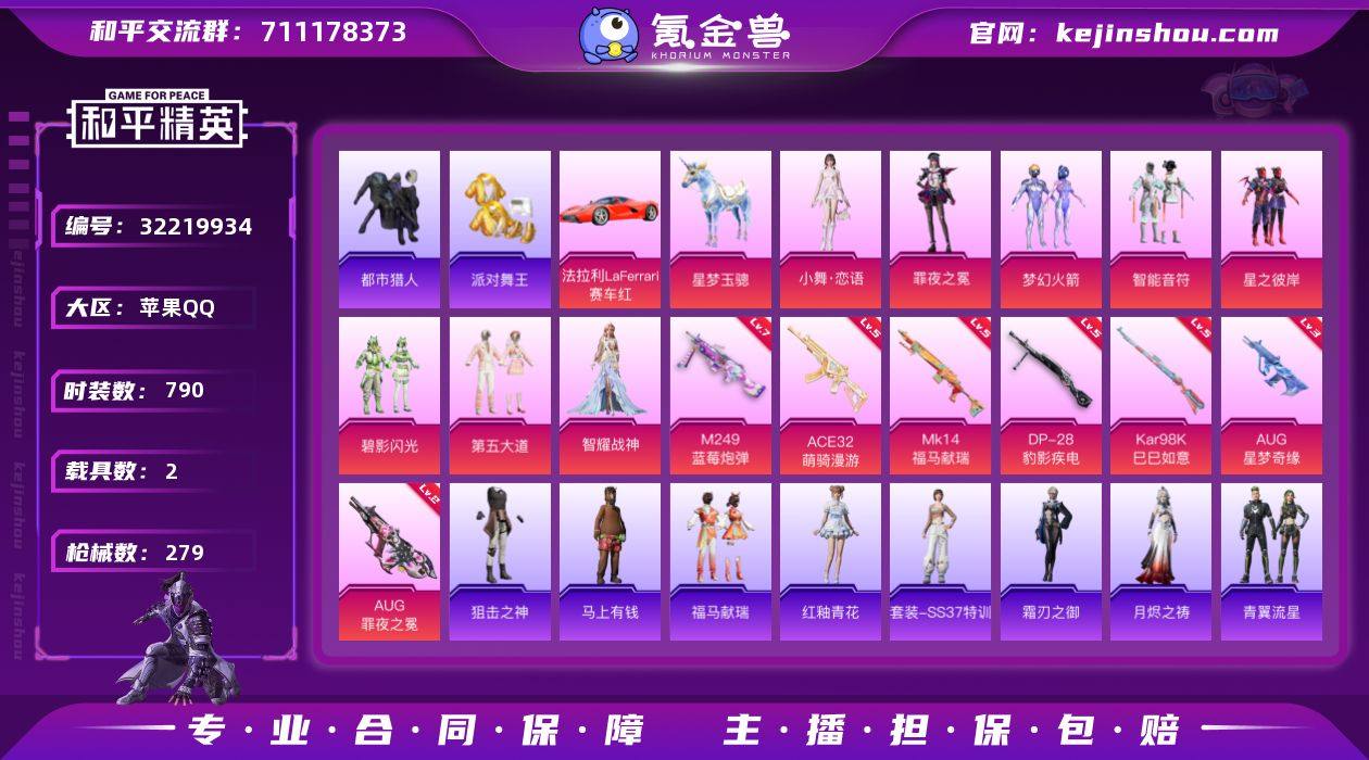 苹果手Q-17王牌印记-8粉装-7特效枪-2载具-83061热力值-208套装-279枪皮-2卓越印记【8粉装】套装-第五大道,套装-智能音符,套装-碧影闪光,角色-智耀战神,套装-星之彼岸,角色-罪夜之冕,人物-小舞·恋语,套装-梦幻火箭【7特效枪】M249-蓝莓炮弹/7级,Mk14-福马献瑞/5级,Kar98K-巳巳如意/5级,DP-28-豹影疾电/5级,ACE32-萌骑漫游/5级,AUG-罪