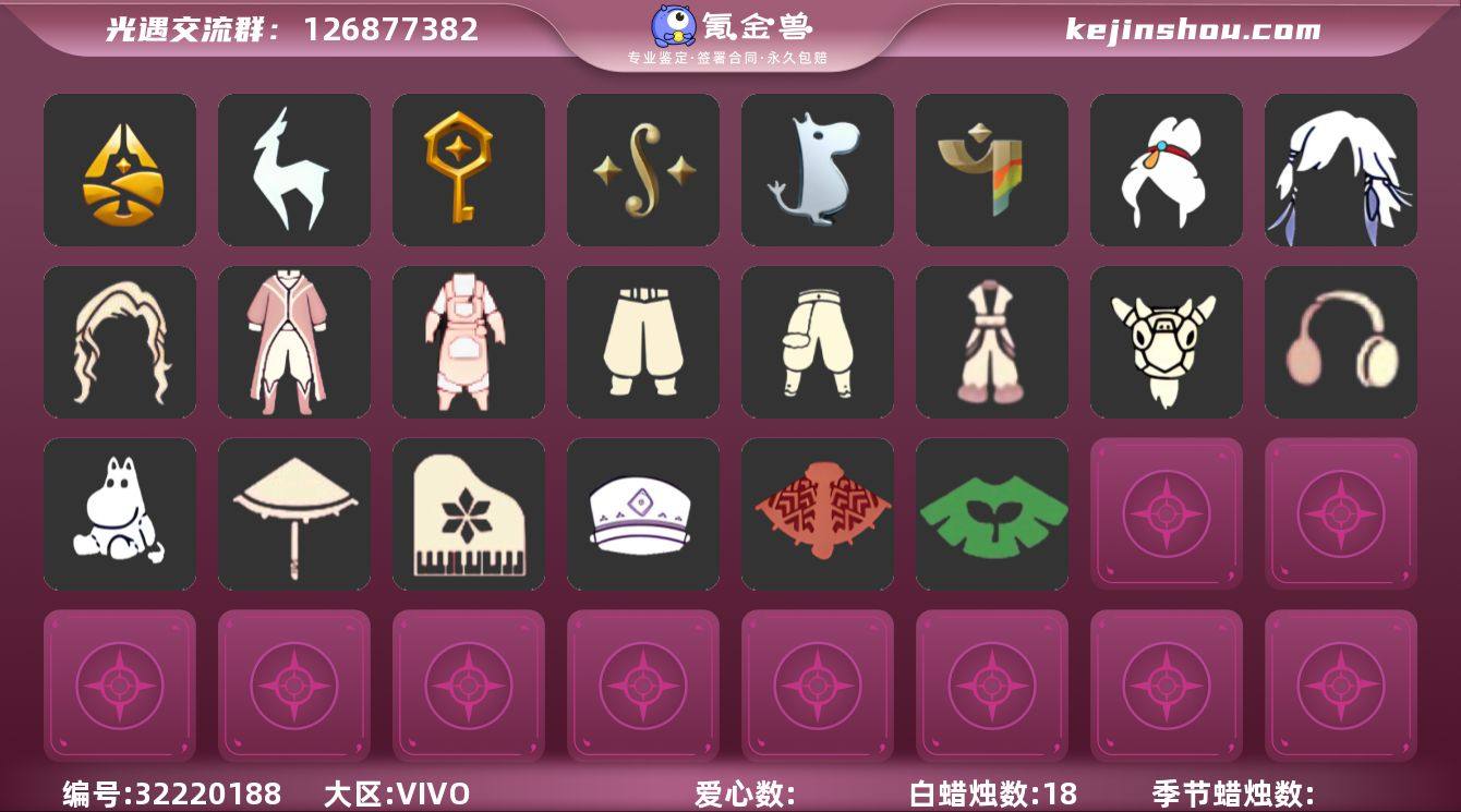 [17049565]VIVO 手机账号 1珍稀物品 6毕业季 2毕业图 18蜡烛 【珍稀物品】彩虹围巾(五塑彩带斗) 【季节已毕业】归巢季,九色鹿(九色鹿季),筑巢季,二重奏季,姆明季,彩染季 【完成地图】雨林,霞谷 【礼包】青衫落拓礼包,巫师(巫师帽),绊爱(绊爱斗篷)(绊爱礼包),橘子(大橘大利),兔子(玉兔头饰)(玉兔发饰)(兔子发饰),大耳狗发饰(迷你大耳狗发饰),四叶草(四叶草头饰),九色鹿角(神鹿祝福头饰)(神鹿祝福礼包),彩虹耳机,创始人(创始人斗篷),欧若拉之翼,莲花斗(异彩莲花斗篷),蝙蝠套(蝙蝠斗篷)(南瓜头),人声乐器(欧若拉之声),红伞(瑞气纸伞) 【裤子】筑巢季·裤子(设计师长袍),青鸟尊贵蓬头裤子(蓝色燕尾服),飞天裤(柔缎花边连)(九色鹿丝带裤),妮妮裙子(妮妮长裙),武士裤,搓澡巾 【面具】辉光羚羊面具 【面饰】红耳机 【发型】飞天盘发(九色鹿丸子头),虚荣,归巢毕业发型(五塑彩羽发),若笠(箬笠) 【头饰】平顶帽,蓝色音乐会(蓝色音乐符) 【斗篷】彩染围巾斗篷,绿芽,海洋斗 【配饰】小红伞(姆明红伞)(姆明大伞),姆明抱枕,二重奏挂画(合奏挂画),雨伞,筑巢季·小手办(光之子试衣),高音钢琴(白色高脚钢琴)