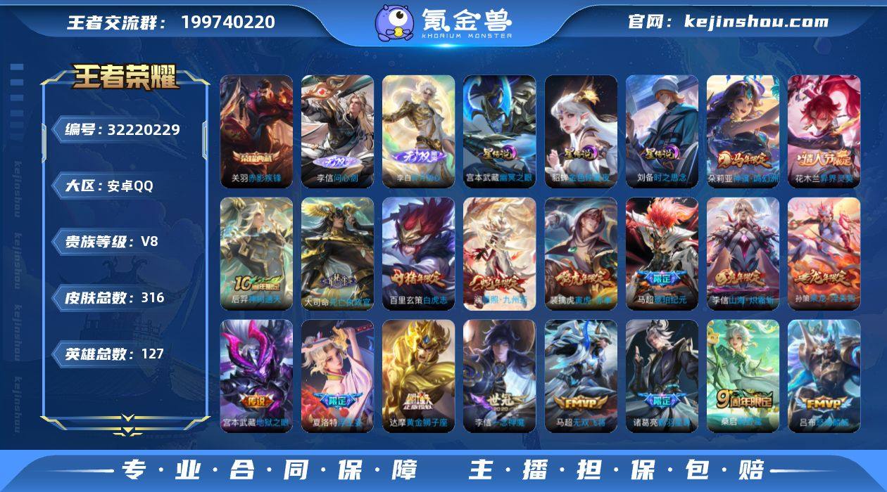 贵族等级:V8 典藏皮肤数:1 珍品无双皮肤数:0 无双皮肤数:2 珍品传说皮肤数:0 传说皮肤数:22 史诗皮肤数:96 皮肤数:316 英雄数:127 段位:荣耀王者