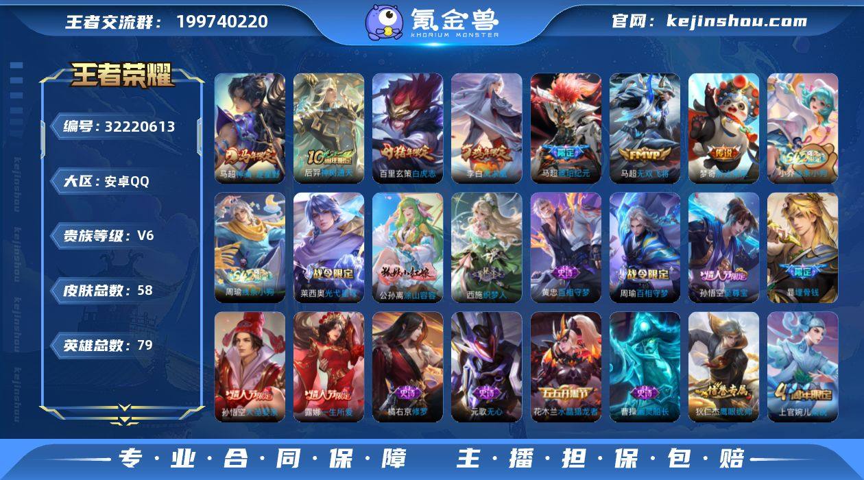 贵族等级:V6 典藏皮肤数:0 珍品无双皮肤数:0 无双皮肤数:0 珍品传说皮肤数:0 传说皮肤数:7 史诗皮肤数:23 皮肤数:58 英雄数:79 段位:荣耀王者 卖家说:王者转瓦 不怎么打王者了 除皮肤外每个赛季都上了50+ 星元币4000 荣耀夺宝180 李白省标和马超9000分