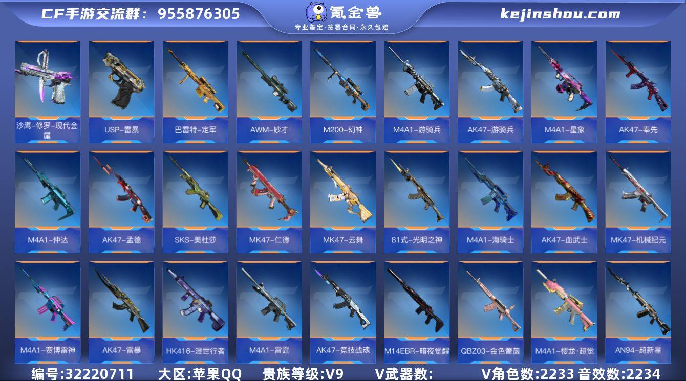 手Q-苹果-可二次-6三国-12王者武器-入手成品号,等级139,VIP9,V武器数:289 ,V角色数:11 【人物角色】葵,蝉,雅典娜, 【王者武器】王者之霆,王者之掣,王者之心,王者之心,王者之影,王者之翼,王者之魄,王者之势,王者之戮,王者之力,王者之魂,王者之锋,王者之啸,王者之击,王者之神,王者之狱,王者之隐, 【带V枪械】龙啸,巴雷特-毁灭,巴雷特-毁灭,巴雷特-毁灭,巴雷特-毁灭,巴雷特-毁灭,麒麟刺-堕天神,麒麟刺-堕天神,地狱烈炎,尼泊尔-雷霆,尼泊尔-雷霆,M4A1-心动次元觉醒,马来剑-毁灭,马来剑-毁灭,麒麟刺,麒麟刺,柯尔特-仲达,SCAR-探星者,M4A1-运输船,M4A1-运输船,屠龙,屠龙,屠龙,AK47-Rush-星速,神罚战斧,神罚战斧,M4A1-海骑士,墨刃-幻神,M4A1-赛博雷神,M4A1-雷霆,血月,血月,血月,M4A1-仲达,98K-星神,M4A1-樱龙·超觉,VEPR12-宙斯,M4A1-星象,M4A1-游骑兵,M4A1-天使,M4A1-玫瑰精灵,M4A1-死神,M4A1-死神,M4A1-黑骑士,M4A1-雷神,M4A1-雷神,MK47-云舞,MK47-机械纪元,MK47-仁德,AK47-血武士,AK47-血武士,AK47-雷暴,斩魔剑-天使,沙鹰-宇航兔兔,AN94-赳赳秦师,AN94-赳赳秦师,AK47-孟德,AK47-奉先,AK47-竞技战魂,嗜血金鲨,COP 357-堕天神,COP 357-堕天神,GLOCK18-猎神,AK47-游骑兵,QBZ97-浩瀚征途,9A91-魔蜥觉醒,星芒,星芒,AK47-黑武士觉醒,AK47-火麒麟,AK47-无影,81式-光明之神,丛林匕首-火力竞放觉醒,炽芒蝶刃,AN94-超新星,HK416-混世行者,女皇利刃-铁胆虎魄,SKS-美杜莎,地狱火,M14EBR-暗夜觉醒,M14EBR-暗夜,匕首-冰魂觉醒,M4A1-太白诗仙,SCAR-幽暗骑士,穷奇铁扇,QBZ03-金色蔷薇,QBZ03-金色蔷薇,98K-黑骑士,M200-心动次元觉醒,M200-幻神,斩神刀